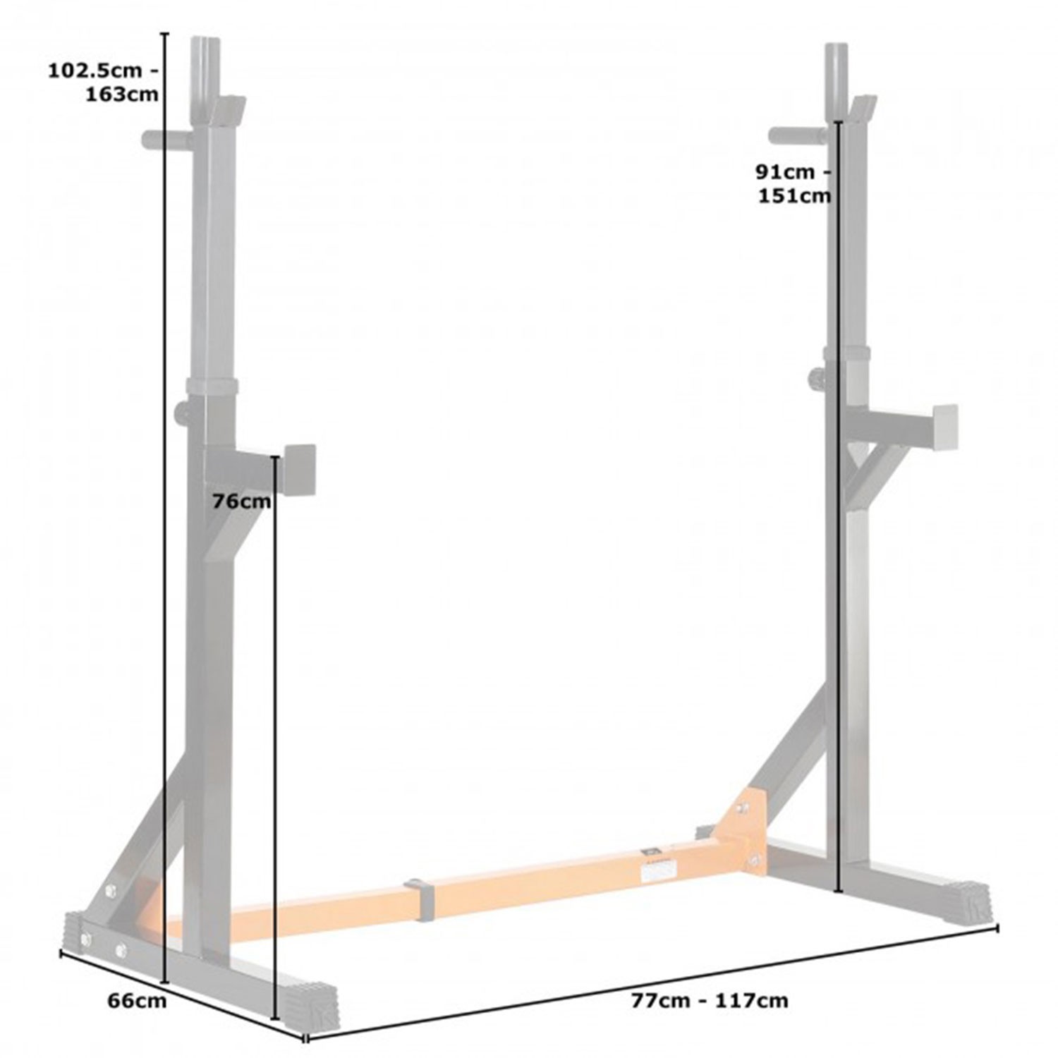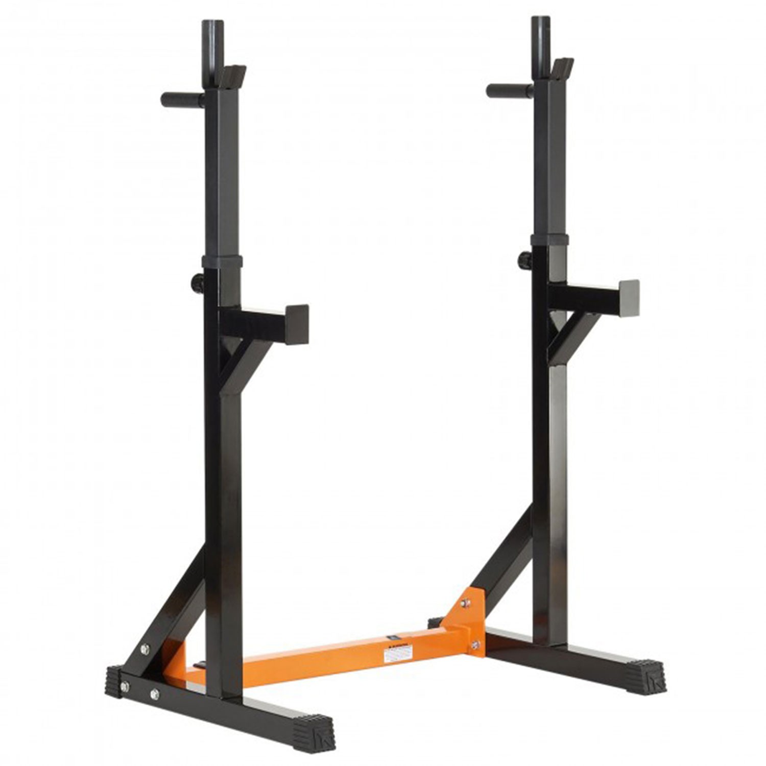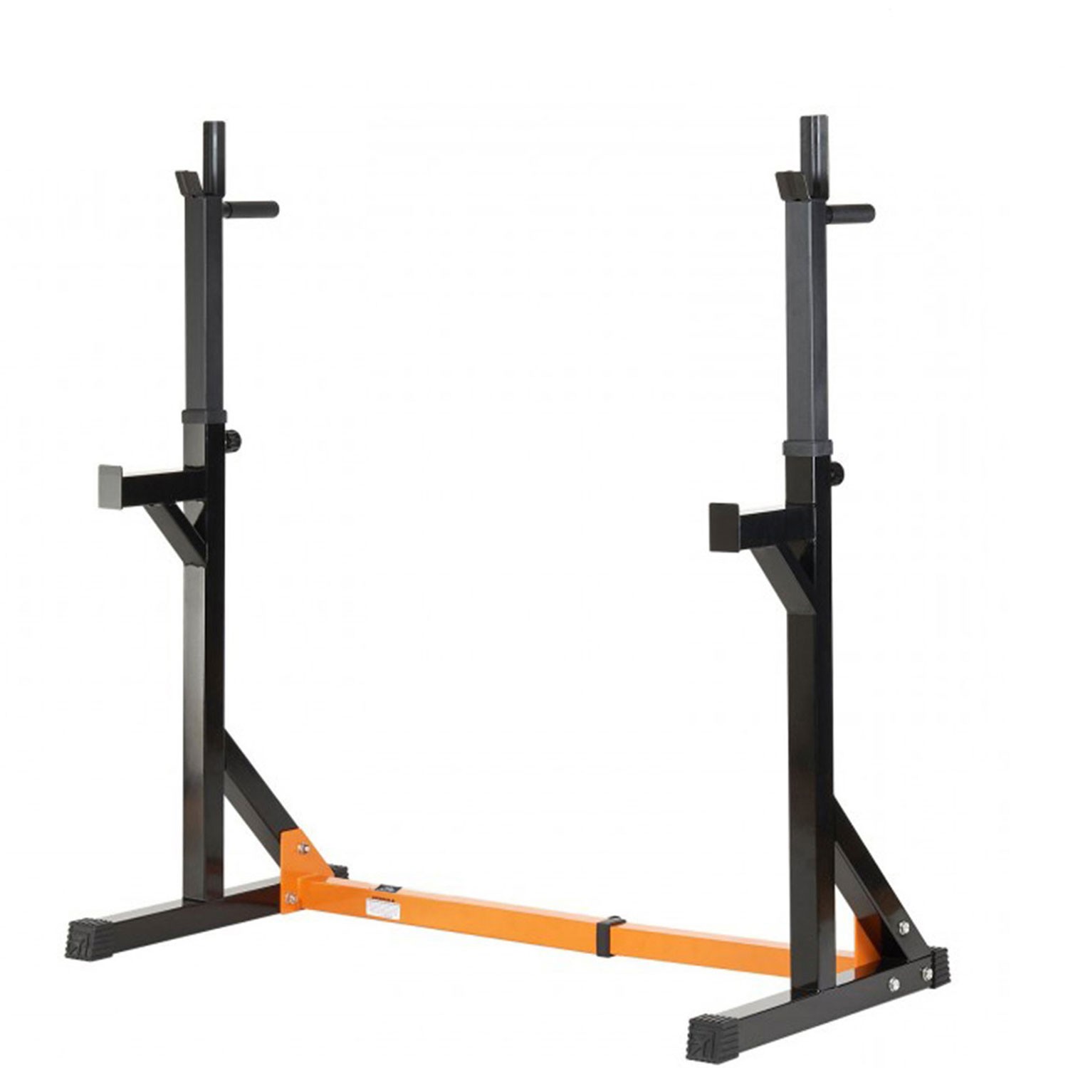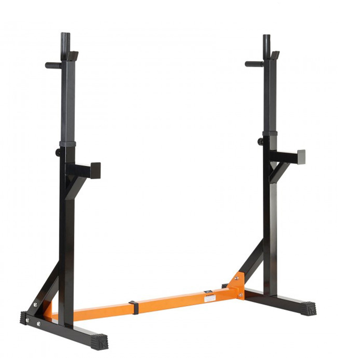 Тренажер со свободными весами. Позволяет выполнять широкий спектр упражнений со штангой: приседания, жим и другие. Стойки под штангу регулируются по ширине на расстоянии от 77 до 117 см друг от друга. 10 уровней с шагом 5 см. Держатели под штангу регулируются по высоте в диапазоне от 93 до 151 см. 13 уровней с шагом 5 см. Страховочные держатели под штангу шириной 20 см расположены на высоте 76 см от пола. Рама стойки изготовлена из высококачественного стального профиля. Размер 50х50 мм. Порошковая покраска рамы в черно - оранжевый цвет. Резиновые ножки для надежной установки на полу. Не царапают поверхность.