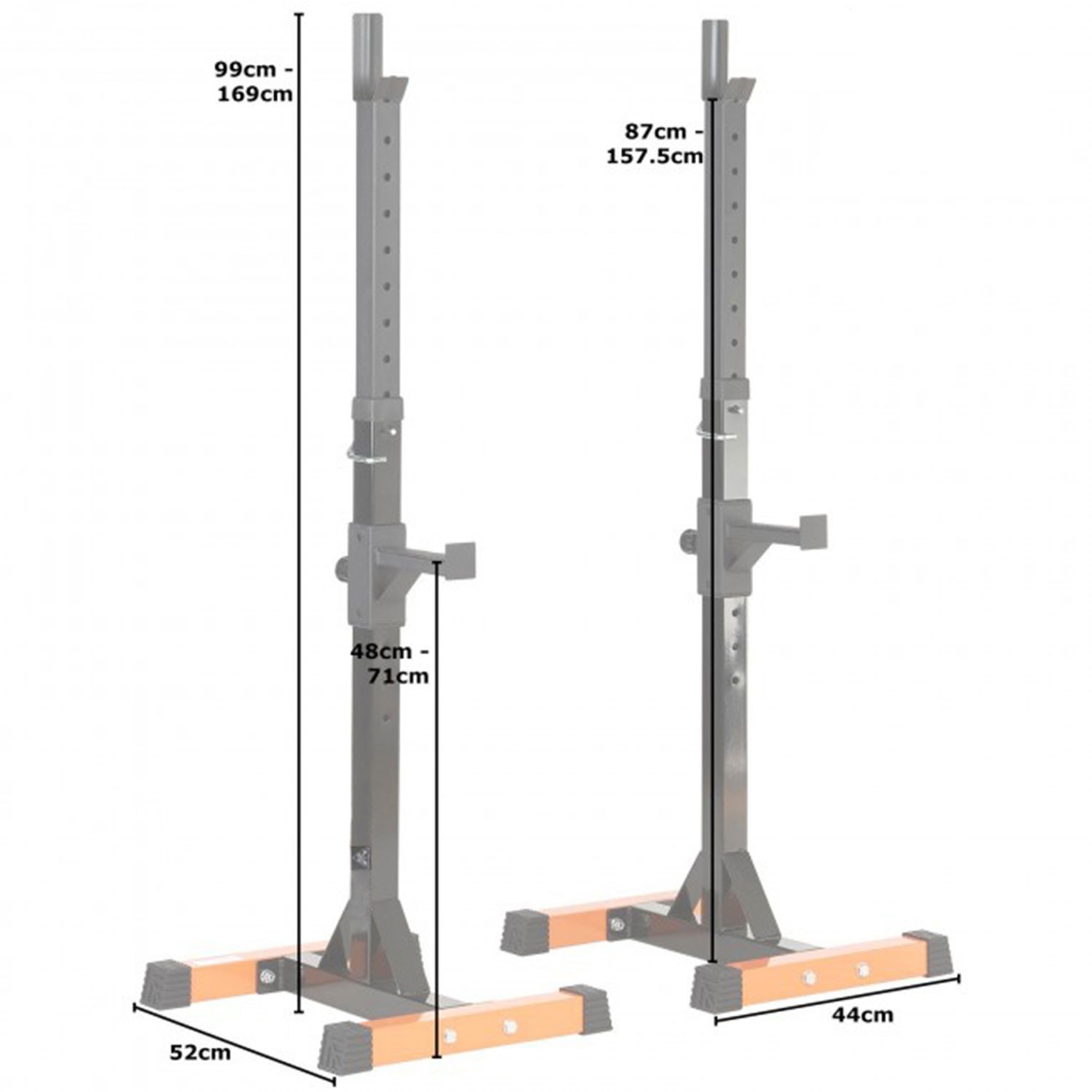 Тренажер со свободными весами. Позволяет выполнять широкий спектр упражнений со штангой: приседания, жим и другие. Две отдельные стойки под штангу позволяют установить их на любом удобном расстоянии друг от друга. Держатели под штангу регулируются по высоте в диапазоне от 87 до 157,5 см. 15 уровней с шагом 5 см. Страховочные держатели под штангу шириной 17 см можно установить на высоте от 48 до 71 см. 6 уровней с шагом 5 см. Рама стойки изготовлена из высококачественного стального профиля. Размер 50х50 мм. Порошковая покраска рамы в черно - оранжевый цвет. Резиновые ножки для надежной установки на полу. Не царапают поверхность. В качестве дополнительной опции для выполнения силовых упражнений рекомендуем приобрести: - силовая скамья универсальная DBCH2-1 или любую другую на выбор - штангу с дисками или гантели на выбор Нагрузка на стойки (общая) до 200 кг Размер каждой стойки 44 х 52 х 99 - 169 см Высота держателей под штангу 87 - 157,5 см Высота страховочных держателей 49 - 71 см Ширина страховочных держателей см Размер упаковки 95,5 х 43 х 16,5 см Объем упаковки 0,068 м³ Вес нетто 17 кг Вес упаковки 19 кг Бренд DFC Страна производтва Китай Гарантия 12 месяцев Инструкция скачать Дополнительные фото товара.