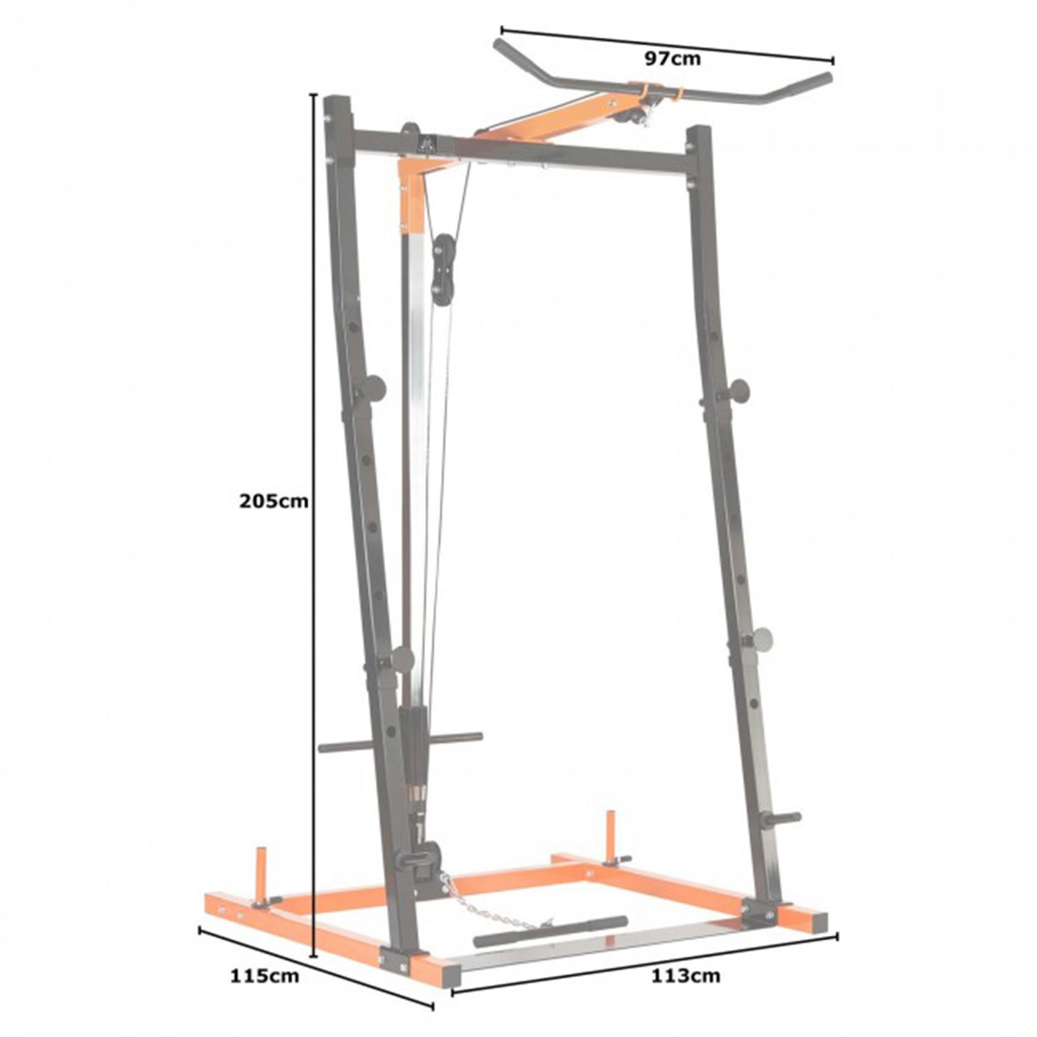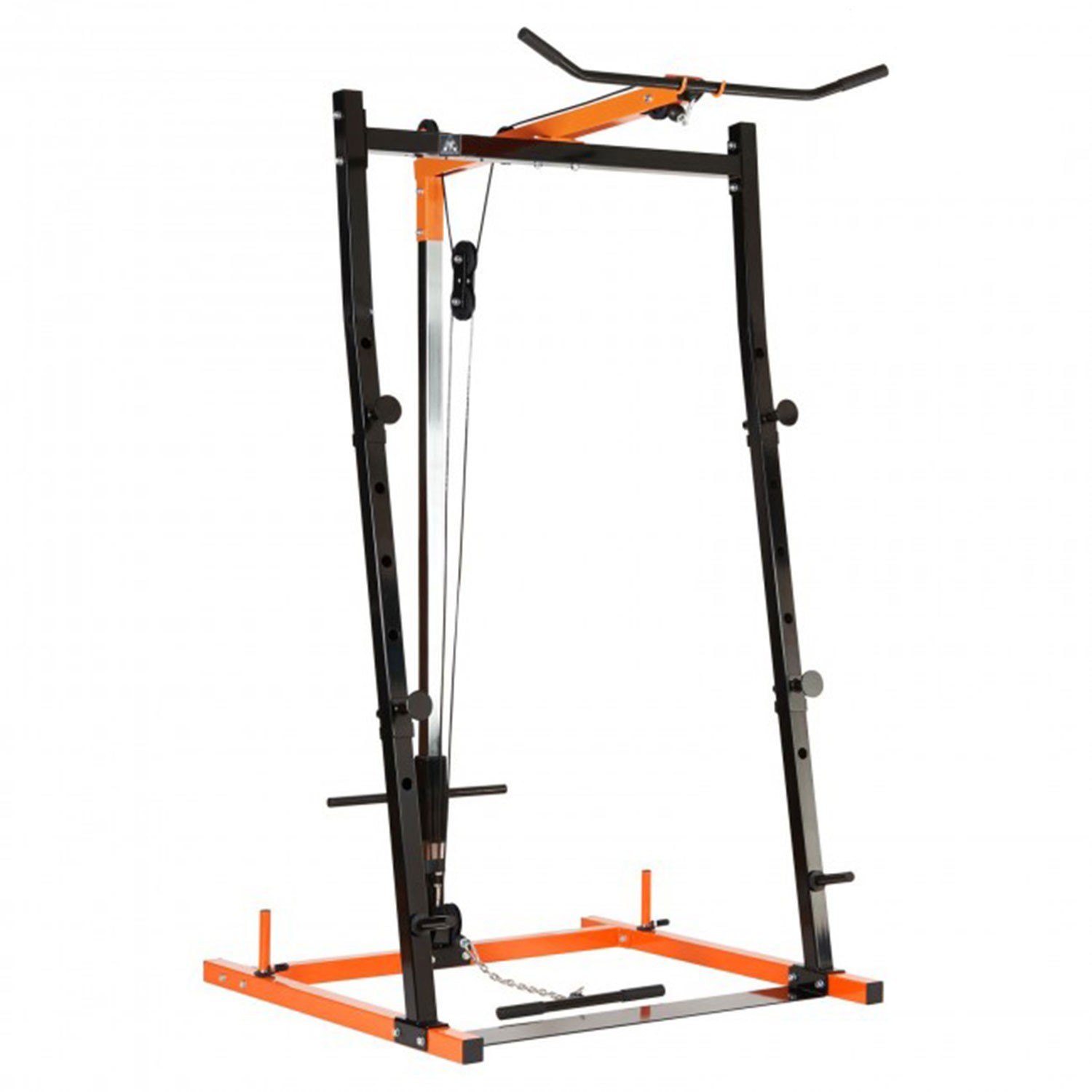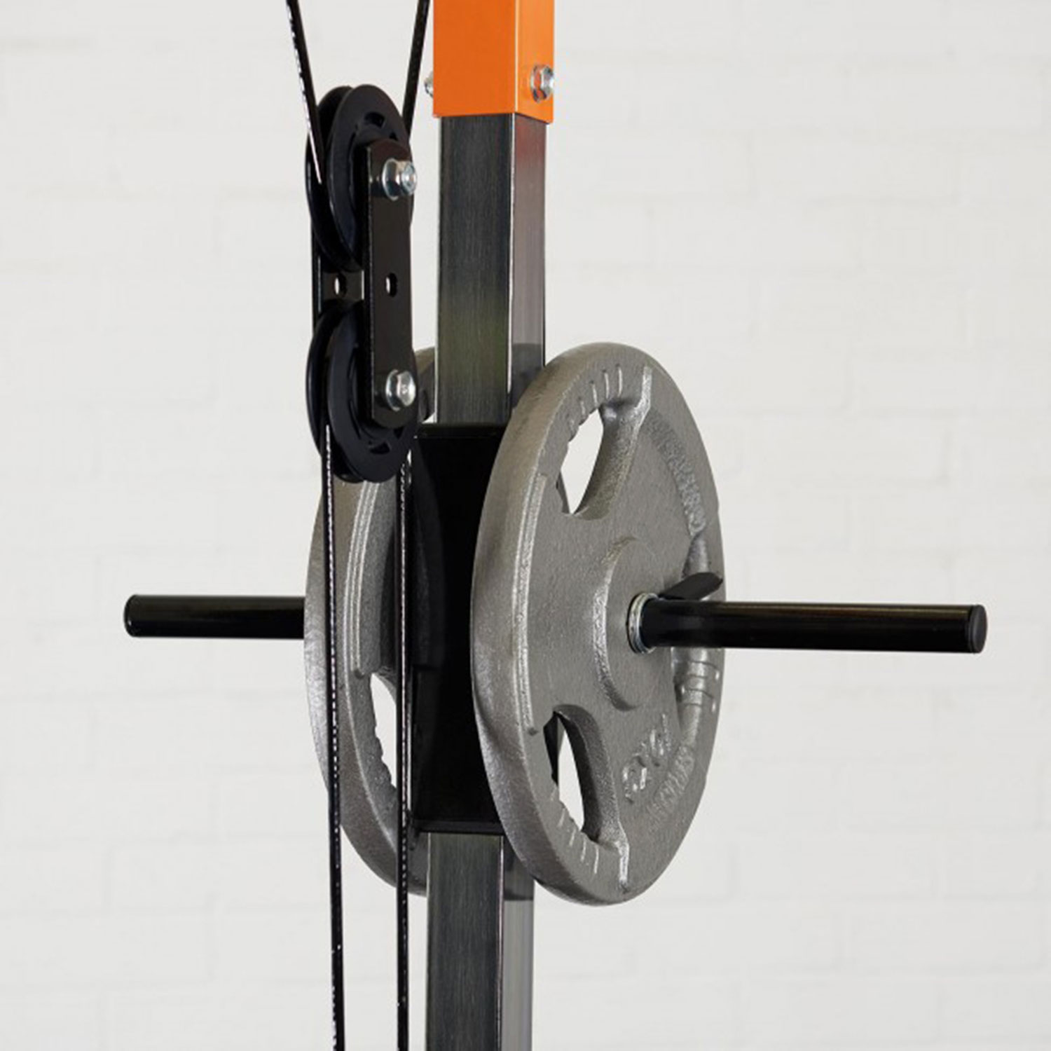 В качестве нагрузки для верхней и нижней тяги используются диски Ø25 мм (1") общим весом до 100 кг. Диски размещаются на 2 держателя по 19 см каждый. Фиксация с помощью замков - пружина в комплекте.