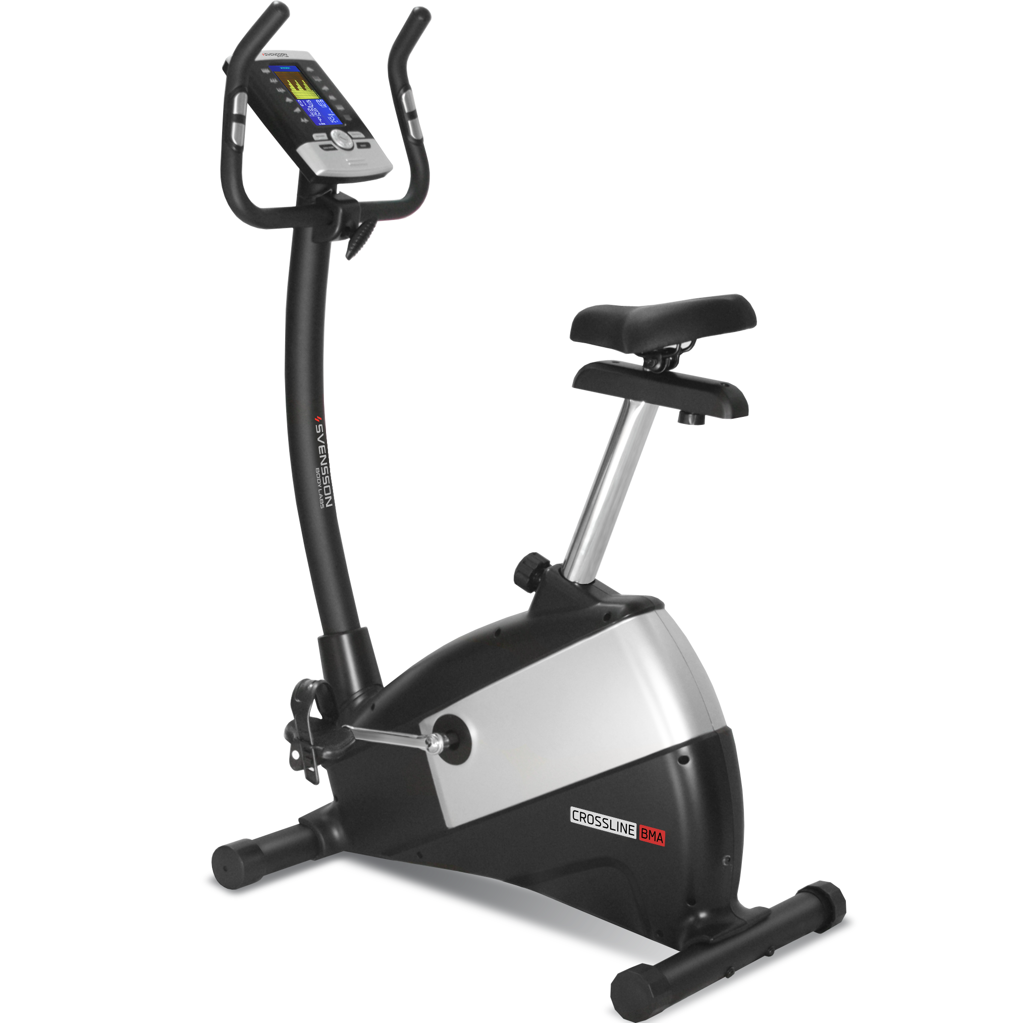 SVENSSON BODY LABS CROSSLINE BMA относится к числу премиальных велоэргометров. Конструкция рамы выполнена из высокопрочного профиля и выдерживает пользователя весом до 140 кг. Запатентованная приводная система электромагнитного типа SpinMaster EMS построена на основе утяжеленного сбалансированного маховика весом 11 кг, высокоточных шведских подшипников производства SKF и трехкомпонентного шатуна велосипедного типа. Связка этих компонентов обеспечивает самое плавное педалирование в широчайшем диапазоне нагрузок. К числу существенных биомеханических преимуществ относится возможность регулировки сидения не только в вертикальном, но и горизонтальном положениях, круговая регулировка положения руля, удобное эргономичное сидение анатомической формы и рифленые антискользящие педали с прорезиненными многопозиционными ремешками. Хромированный подседельный штырь не только защищает поверхность от царапин, но и придает тренажеру большую внешнюю эффектность.Тренировочный компьютер представлен многофункциональным цветным LCD-дисплеем диагональю 14,5 см. В программный пакет входят 12 предустановленных программ, направленных на тренировку скоростных качеств, выносливости, укрепления сердечно-сосудистой системы и похудания. Помимо предустановленных программ, можно воспользоваться самостоятельно регулируемым ручным режимом, а также создать собственную программу. Для тренировок с контролем пульса существуют 4 пульсозависимые программы с предустановленными значениями 55%, 75%, 90% и 100% от целевого максимального пульса. Эргонометрическая функция (ватты) позволяет зафиксировать необходимый уровень нагрузки - он останется постоянным вне зависимости от скорости вращения педалей. По завершении тренировки функция Recovery оценит способность сердечно-сосудистой системы к восстановлению. К числу дополнительных характеристик велотренажера относятся такие опции как транспортировочные ролики и компенсаторы неровностей пола. Также консоль полностью русифицирована. Таким образом, переместить изделие из одного места в другое не составит большого труда даже для хрупкой девушки, а компенсаторы позволят отрегулировать положение ножек на неровной поверхности.