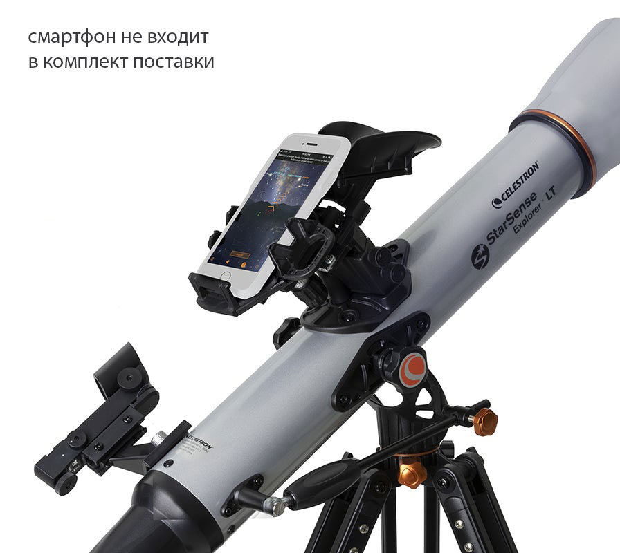 Телескоп Celestron StarSence Explorer LT 80 AZ – ахроматический рефрактор с апертурой 80 мм, который подойдет для изучения объектов ближнего и дальнего космоса. Можно установить объектив 25 или 10 мм, оборачивающая призма позволит вести дневные наземные наблюдения. Оптика модели полностью просветлена – любоваться яркой и резкой картинкой получится даже в черте города. Док-станция StarSense Explorer используется для подключения смартфона к телескопу. Установив соответствующее мобильное приложение на телефон, вы получите доступ к базе интересных объектов, а также сможете быстро и точно наводить прибор на небесные тела. С комплектной азимутальной монтировкой справится даже новичок, ручное наведение облегчит оптический искатель. Прибор фиксируется на треноге из алюминия.
