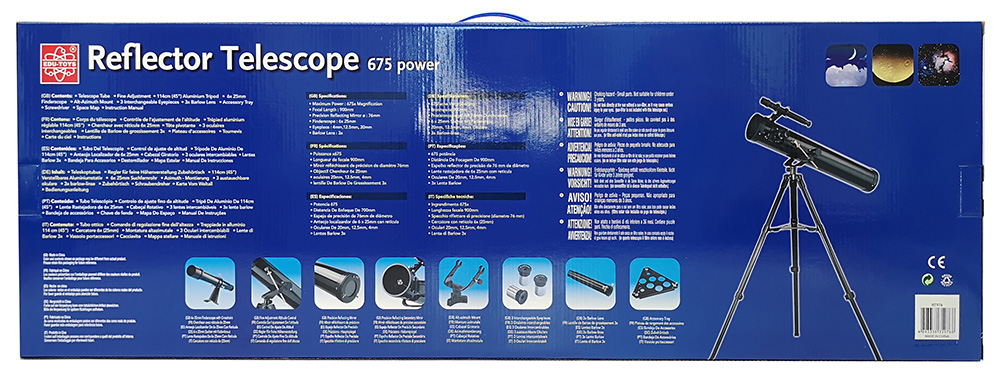 EDU-TOYS 675x – телескоп-рефлектор, предназначенный для детей старше 10 лет. С помощью телескопа можно наблюдать дальний космос и подробно изучать астрономические объекты. Оптическая труба установлена на азимутальную монтировку, оснащенную микровинтом для более точного наведения. Комплектация телескопа включает в себя 3 разнофокусных окуляра и трехкратную линзу Барлоу. В комплект включена алюминиевая тренога, в центре которой можно установить полочку с аксессуарами.