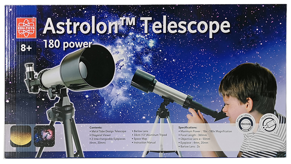 Игрушечный телескоп EDU-TOYS 180x – развивающий оптический прибор для маленьких астрономов. С его помощью можно как обозревать наземные объекты, так и наблюдать Луну. EDU-TOYS 180x также подходит для изучения метеорных потоков. Телескоп-рефрактор отличается компактными размерами и небольшим весом. Оптическая труба установлена на азимутальную монтировку. Оптические элементы телескопа изготовлены из стекла. Прибор поставляется со всеми необходимыми аксессуарами, в том числе с алюминиевой треногой.