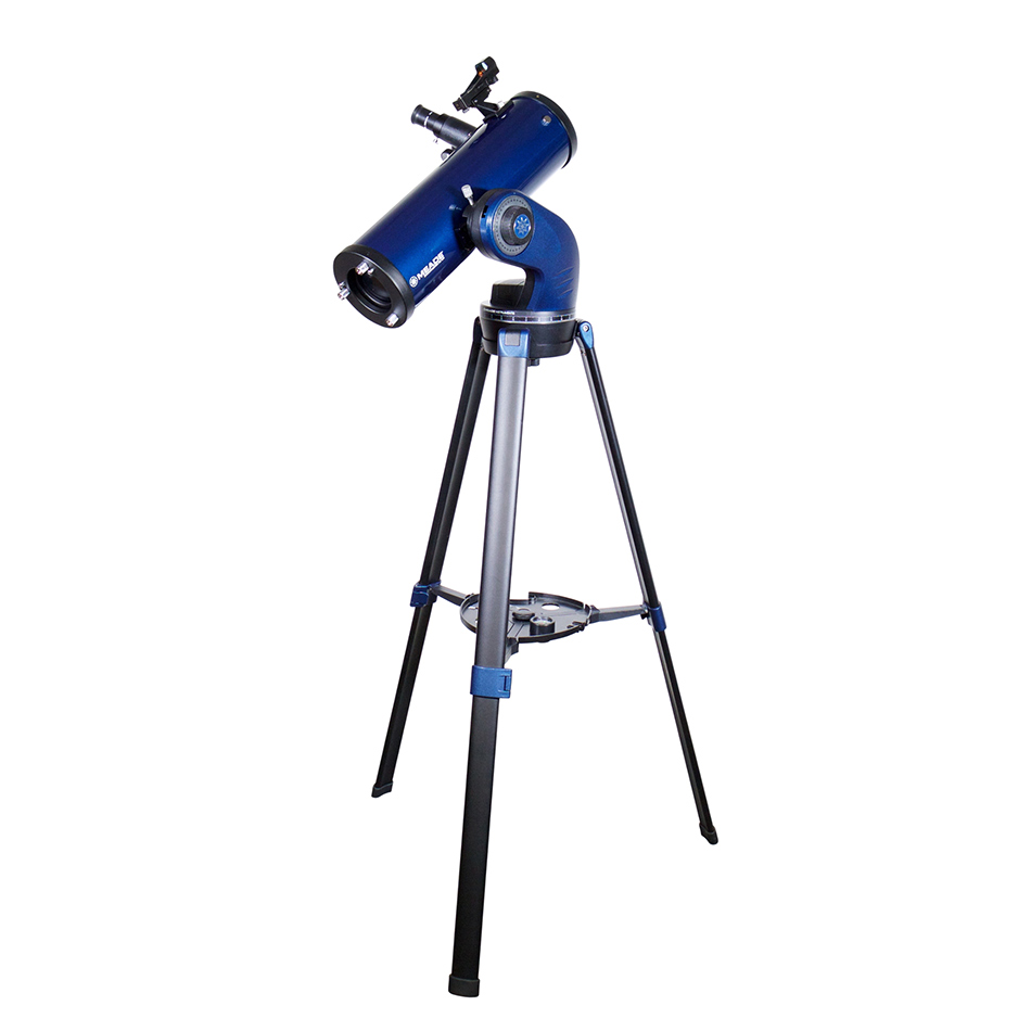 Телескоп с автонаведением Meade StarNavigator NG 114 мм – светосильный зеркальный телескоп на простой в управлении азимутальной монтировке. Оптическая схема прибора – рефлектор Ньютона. Благодаря удобной системе автонаведения AudioStar он подходит начинающим астролюбителям, но при этом радует глаз качественным изображением. Телескоп наводится на небесные тела из базы данных, включающей 38 320 объектов, и может работать в режиме аудиоэкскурсии на английском языке. С этим прибором вы сможете изучить лунные кратеры, полюбоваться кольцами Сатурна и увидеть лед на марсианских полюсах. Отдаленные галактики и туманности также будут доступны для рассмотрения. Телескоп можно подключить к компьютеру, в комплекте программа-планетарий. Надежная тренога с лотком для аксессуаров придает эксплуатации телескопа дополнительный комфорт.