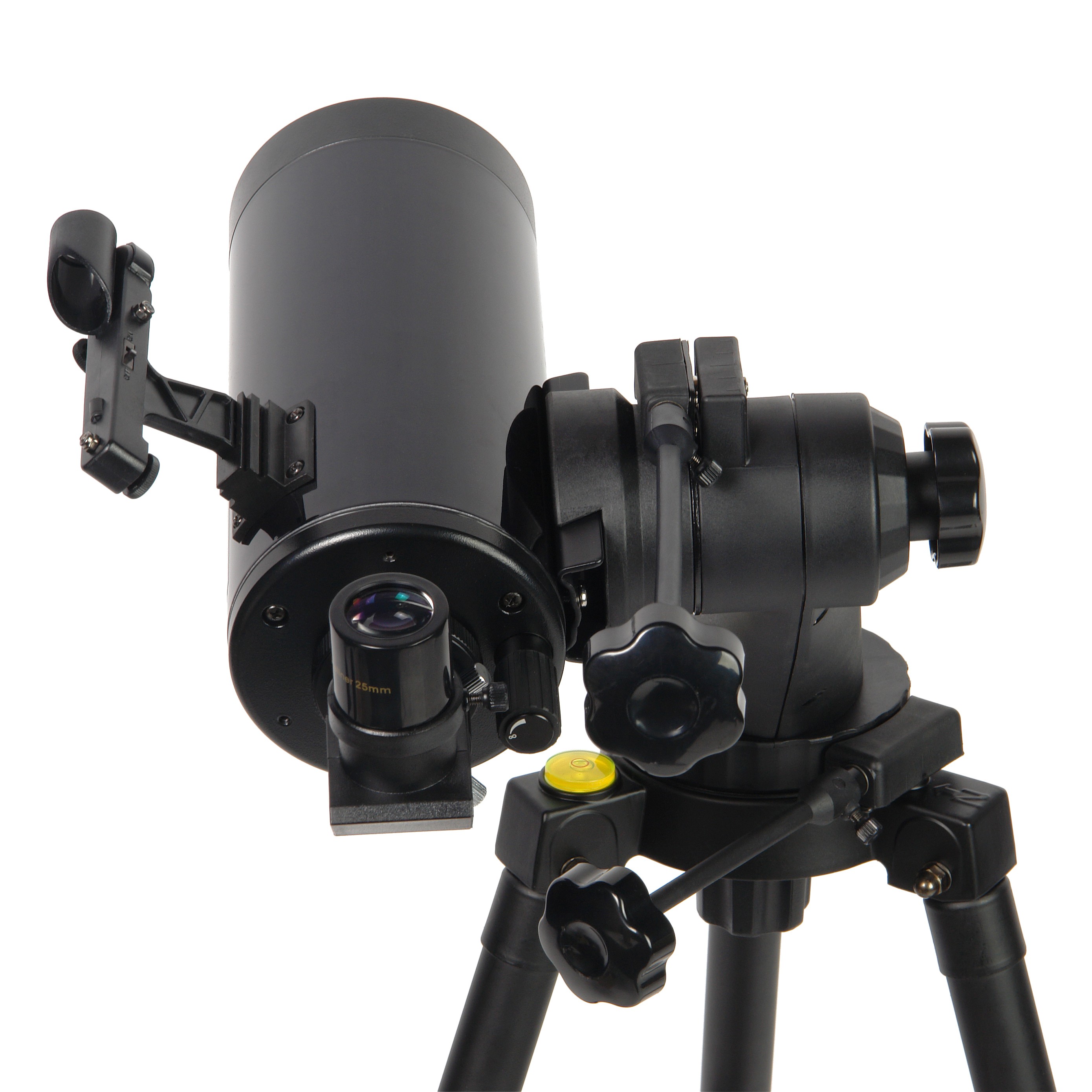 Высота металлического штатива-треноги регулируется от 72 см до 124 см за счет телескопической конструкции с винтовыми фиксаторами. Пластиковые опоры на ножках не позволяют штативу царапать поверхность пола. При использовании телескопа в «полевых» условиях пластиковые опоры выкручиваются вверх и штатив устанавливается на неровную поверхность на «шипах». Для точного выравнивания штатива сверху на корпусе размещен крупный пузырьковый уровень диаметром 25 мм, а для придания устойчивости крепится растяжка с лотком, служащая одновременно полочкой для окуляров.
