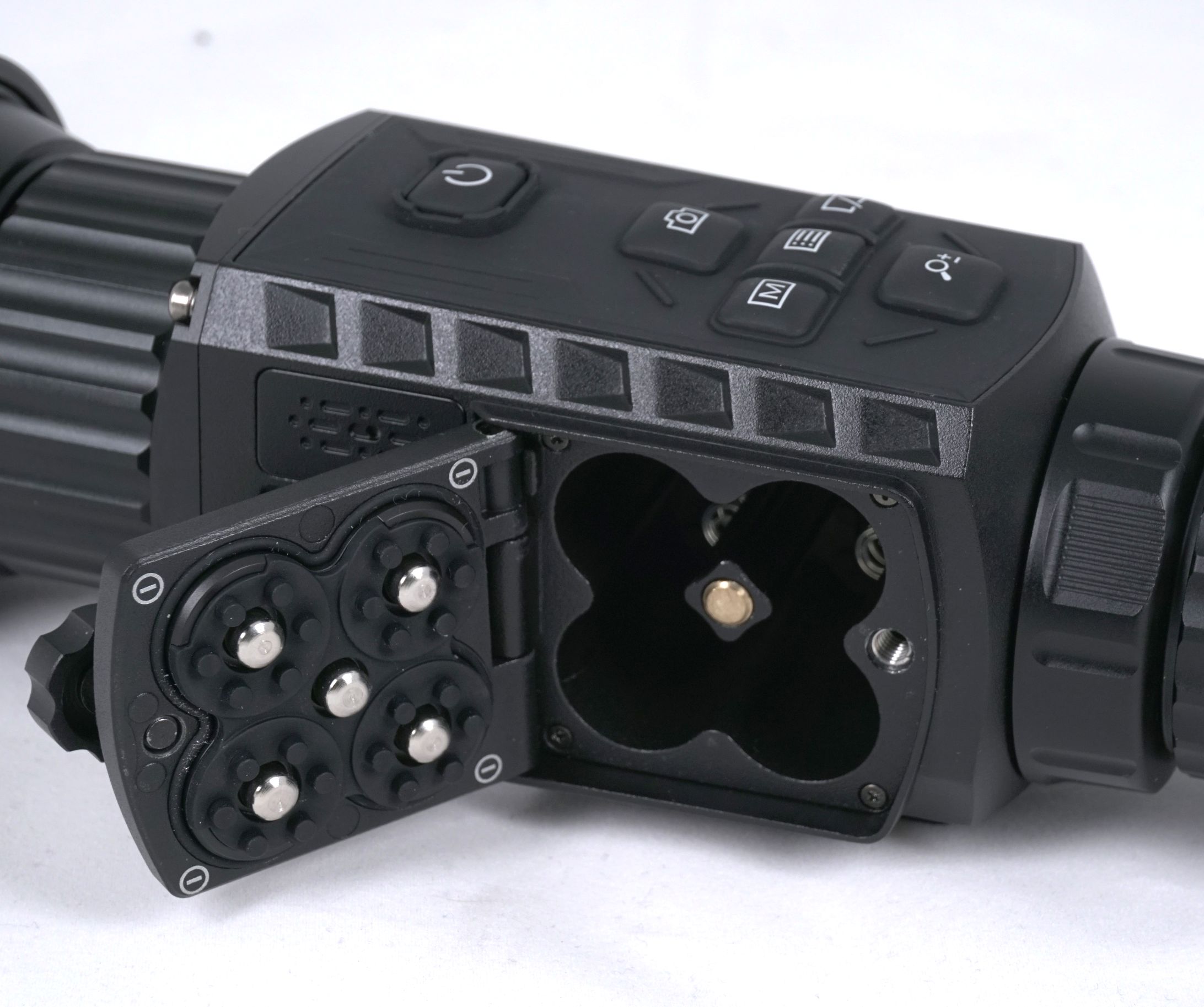 В прицеле предусмотрен отсек для 4-х батарей CR123A либо аккумуляторов того же размера. Прибор может работать от любого количества установленных элементов питания в рамках доступных 4-х мест, даже от одной батарейки.