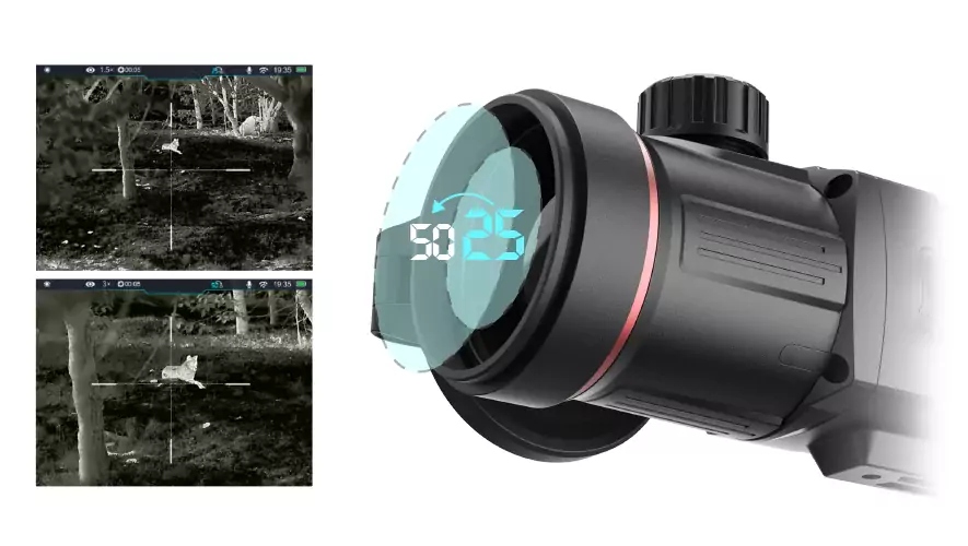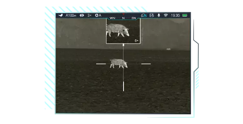 Вы можете одновременно просматривать полномасштабное изображение с привычным углом обзора в основном окне на экране тепловизора, а также увеличенное изображение в два раза в дополнительном окне для точной идентификации цели.