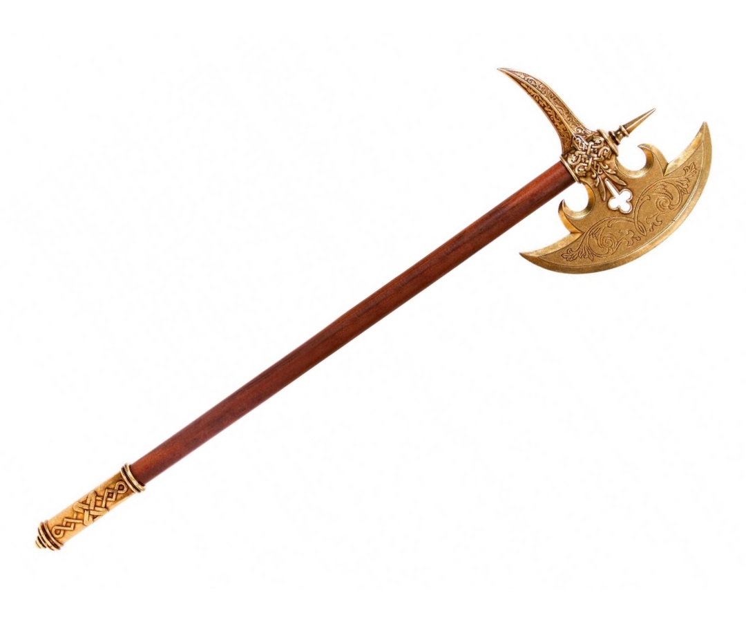 Топор боевой, латунь (Германия, XVI век) DE-5602 – это эффектное изделие из серии исторического холодного оружия эпохи Средневековья. Боевые топоры являлись версией рабочих топоров дровосеков, при этом были более легкими и обладали очень острым лезвием. Кавалеристы германской армии использовали такие топоры в основном для вбивания в щит противника и обеспечения потери им защиты.