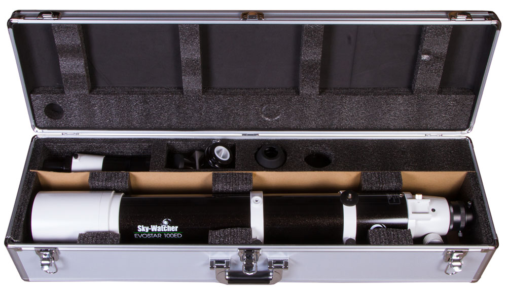 Вместе с оптической трубой идут все необходимые крепежные элементы, базовые оптические аксессуары и алюминиевый кейс для транспортировки и хранения.