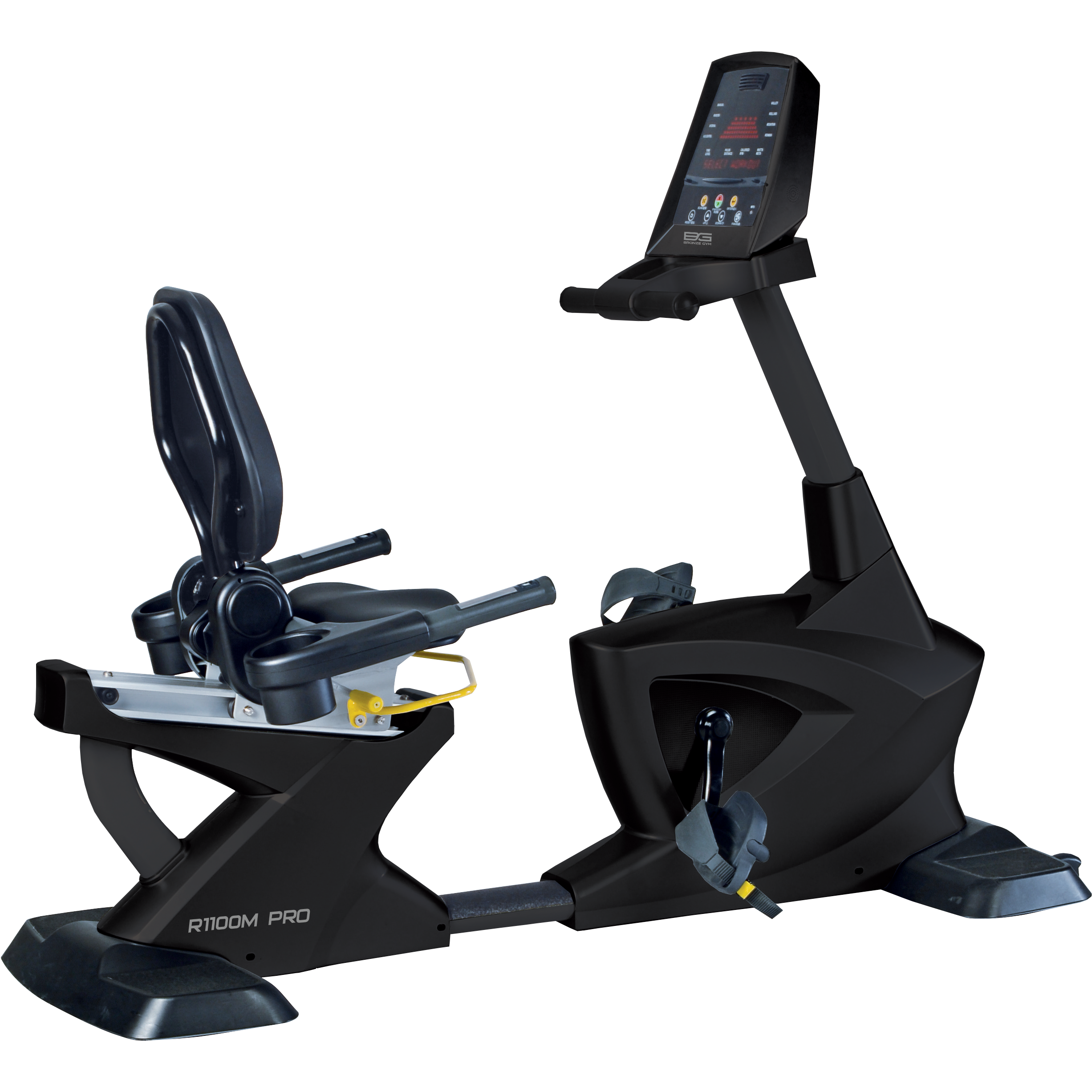 Серия коммерческого кардио оборудования 1100 от Bronze Gym – это первый дизайнерский продукт немецкого бренда. Подача идеи все та же – это крупногабаритное, мощное оборудование, рассчитанное на длительную эксплуатацию в многочасовым режиме, но в более искушенном визуальном исполнении. Серию проектировала международная команда промышленных дизайнеров, которая черпала идеи из индустрии автопрома. Дизайн-форма осталась брутальная. Мягкие и прямые линии сменились на угловатые элементы, а внешний облик кожуха маховика принял очертания треугольных форм. Таким образом, серия 1100 — это удачное сочетание тяжелого оборудования и дизайнерского продукта, модели эффектные, новаторские, спортивные и соответствует всем новейшим тенденциям. R1100M PRO – это велоэргометр с горизонтальной посадкой коммерческого класса, предназначенный для использования в крупных премиальных и бюджетных фитнес клубах. Тренажер, как и подобает профессиональному уровню, оборудован лучшими техническими характеристиками. На R1100M достигнуты оптимальные биомеханические свойства. Велотренажер оснащен электромагнитной системой нагружения с генератором (GMS). В основе маховик с инерционным весом, эквивалентным 18 кг. Учитывая особую направленность горизонтальных велотренажеров, стоит отметить сиденье. Оно мягкое, оснащено широкой спинкой и регулируется по горизонтали. На базе педального узла литой трехкомпонентный шатун на подшипниках. Сами педали широкие, рассчитаны на любой размер ноги и фиксируются специальными регулируемыми ремешками. Кроме того, они покрыты специальным антискользящим рельефом. Традиционно, как и подобает большинству позиций ассортимента Bronze Gym, модель габаритная – 200 см в длину и 65 см в ширину. Велотренажер весьма тяжелый – 96 кг и выдерживает нагрузку до 180 кг включительно. Оборудование поставляется в упаковке из гофрированного картона размером 189,5*71,5*85 см. Важная часть любого коммерческого тренажера – бортовой компьютер. Он также выполнен на высшем уровне. На R1100M PRO установлено несколько дисплеев. Тренировочный прогресс отображается на основной LED-консоли. Ниже расположено 4 дополнительных маленьких дисплея, основной задачей которых является отображение показателей тренировки, куда входят: время, дистанция, уровень нагрузки, расход калорий, пульс, темп, Ватт. В памяти компьютера содержится 6 различных тренировочных режимов и 1 пульсозависимая программа. В консольную часть встроены музыкальные динамики, а также AUX IN вход для воспроизведения аудио через смартфон. Из дополнительных опций стоит отметить наличие сенсорных датчиков измерения пульса на поручнях в районе сиденья, а также быстрых клавиш регулировки нагрузки. Для бутылки с водой и личных аксессуаров установлен специальный увеличенный отсек на передней стойке тренажера. Переместить R1100M можно благодаря 2-м транспортировочным роликам.