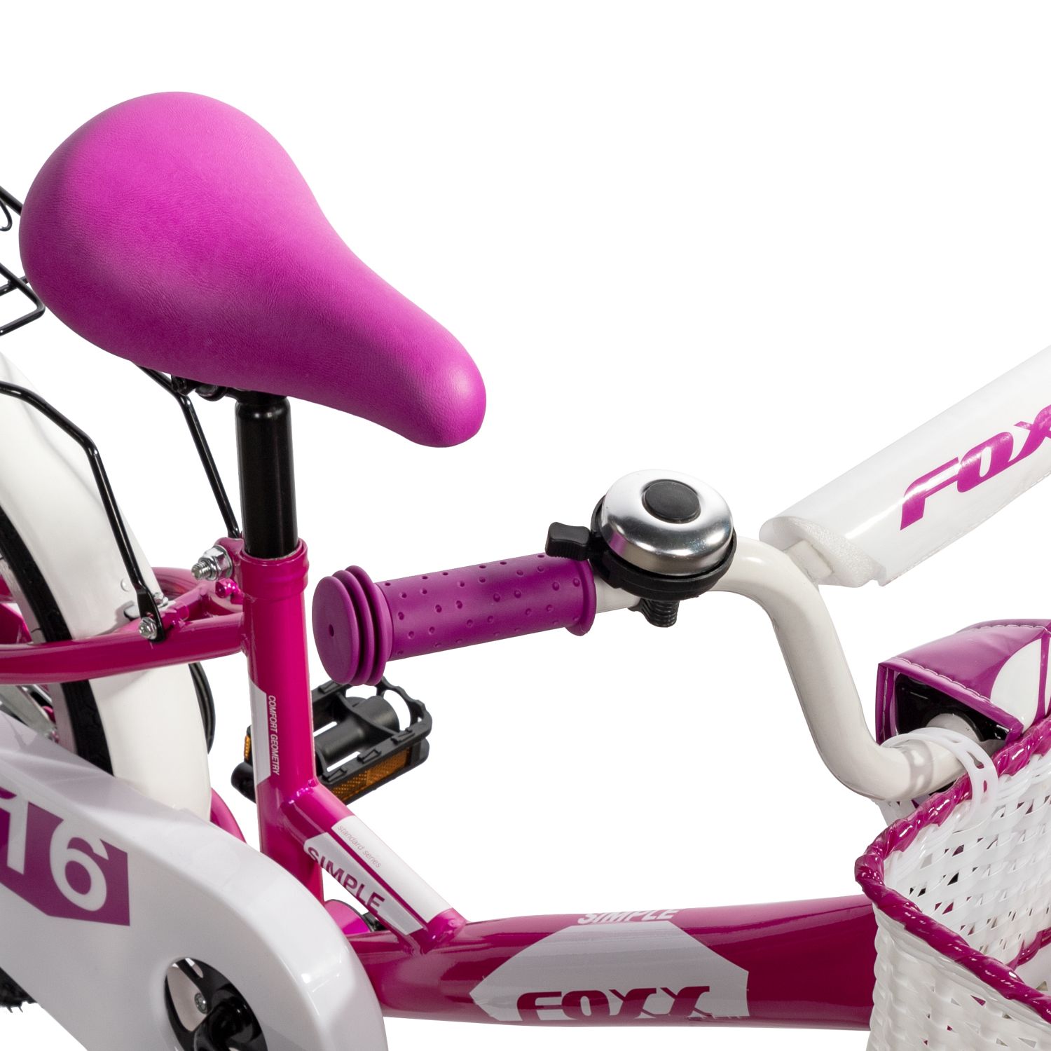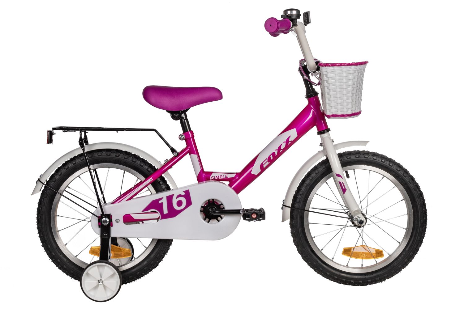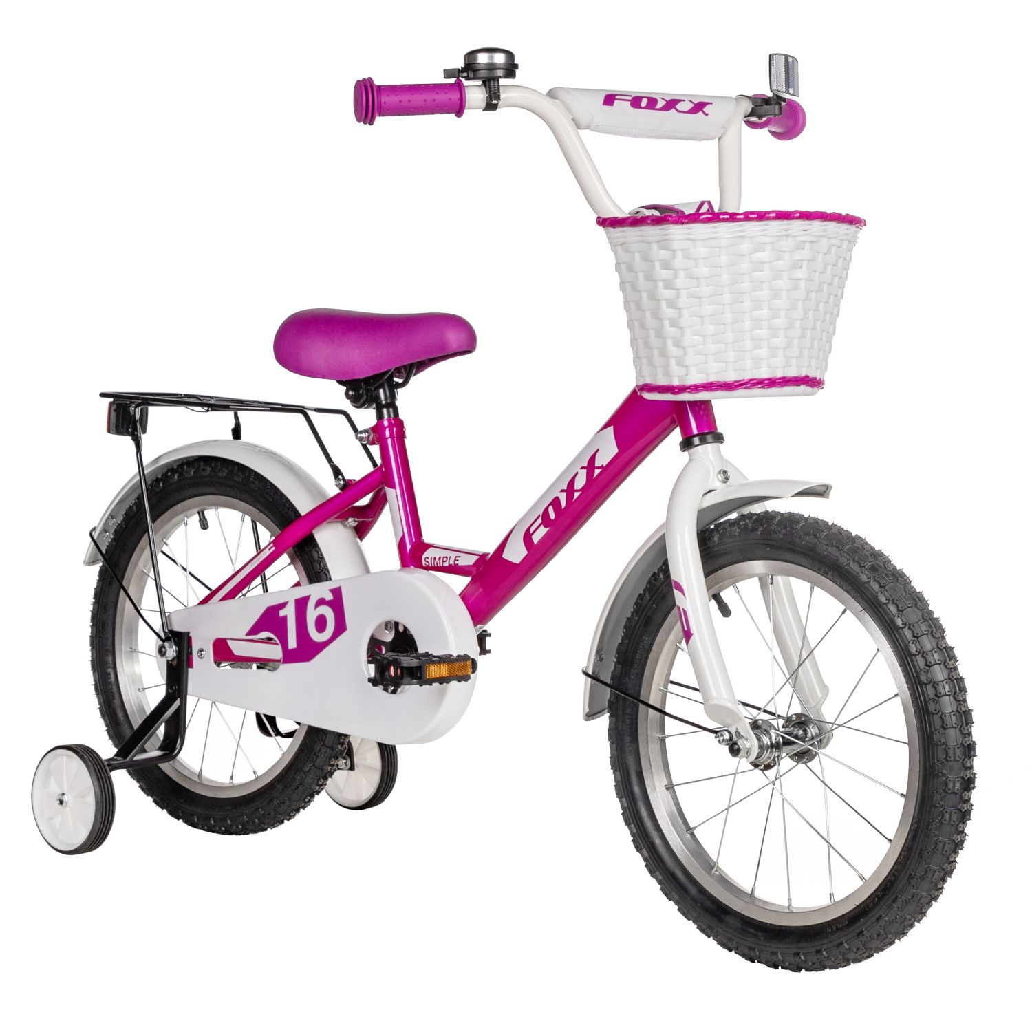 Велосипед FOXX 16" SIMPLE розовый, сталь, тормоз нож, крылья, багажник, полная защ.цепиб передняя корзина