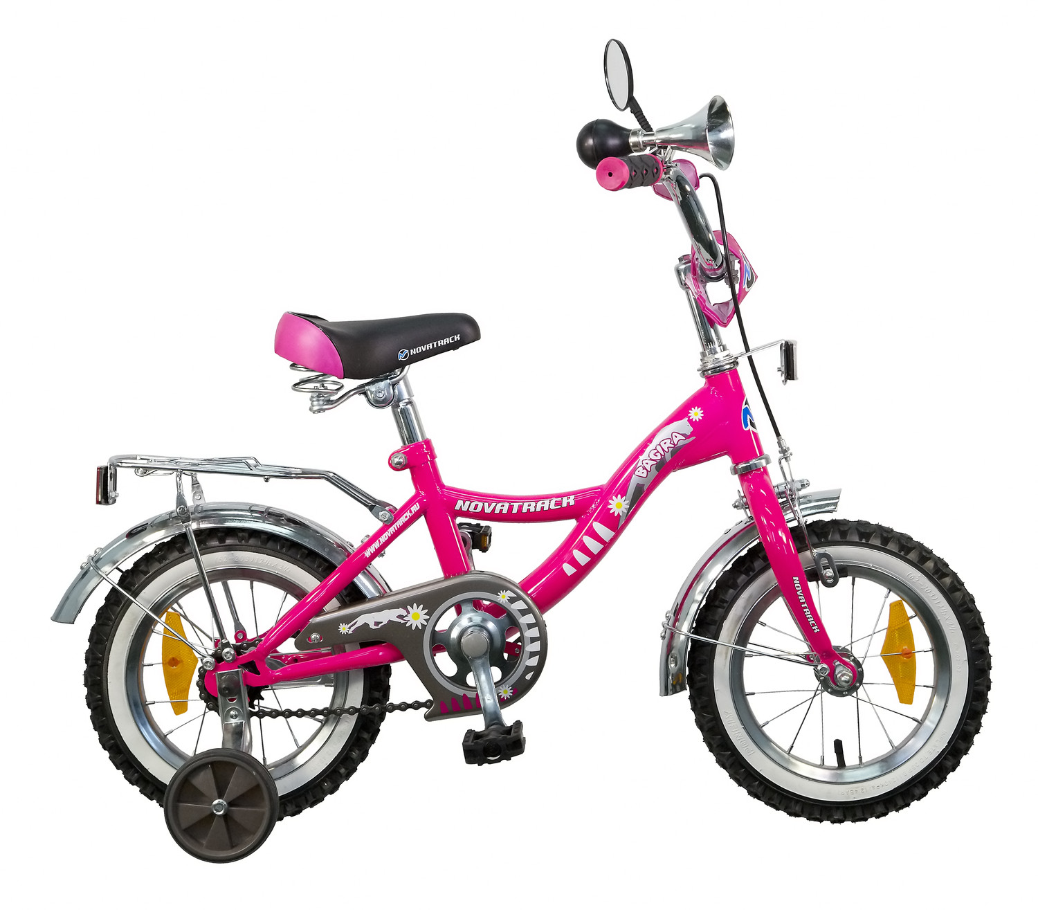 Велосипед NOVATRACK 12",S, Багира, розовый,тормоз 1 руч. нож.,крылья и багажник хромир #038289