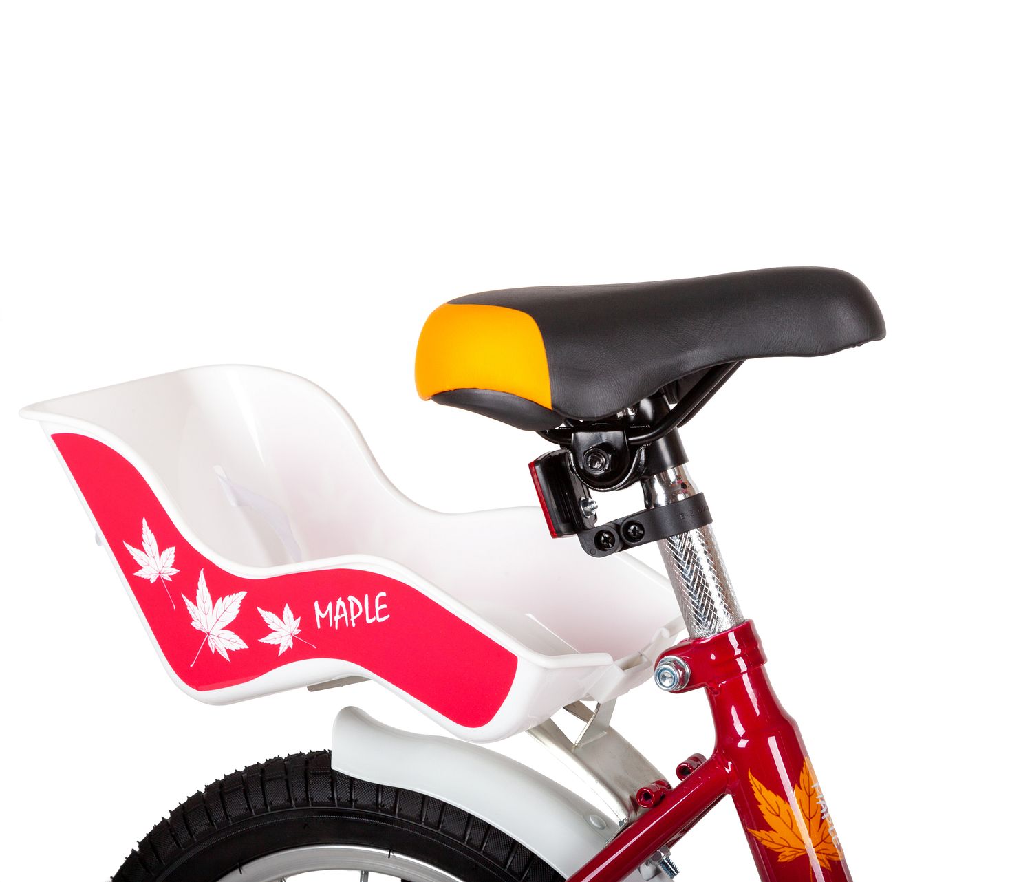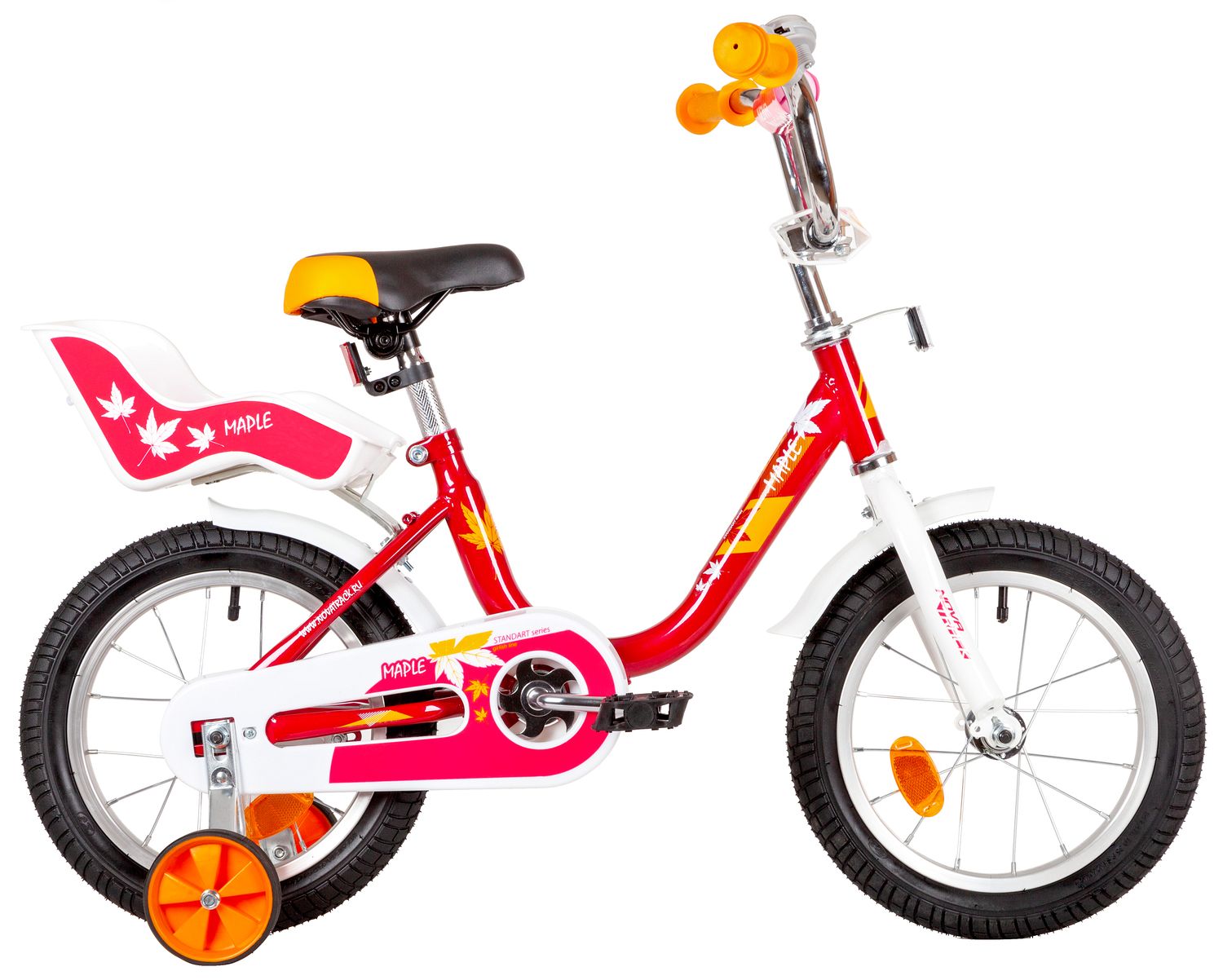 Велосипед NOVATRACK 14" MAPLE, красный, полная защита цепи, тормоз нож, крылья цвет, сидение для куклы