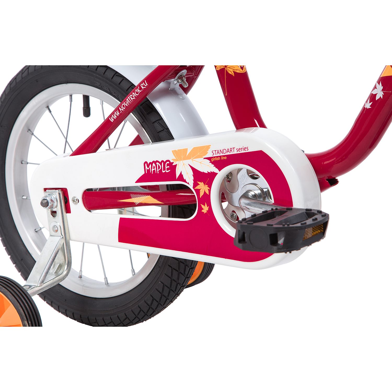 Велосипед NOVATRACK 14" MAPLE, красный, полная защита цепи, тормоз нож, крылья цвет, сидение для кук