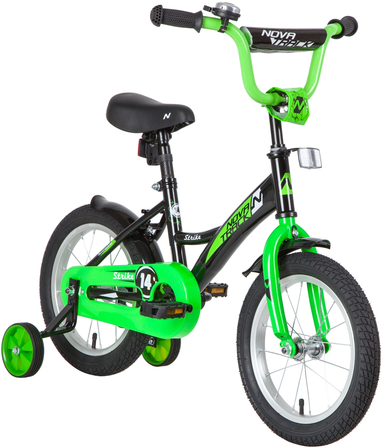 Велосипед NOVATRACK 14" STRIKE чёрный-зелёный, тормоз нож, крылья корот, полная защ.цепи