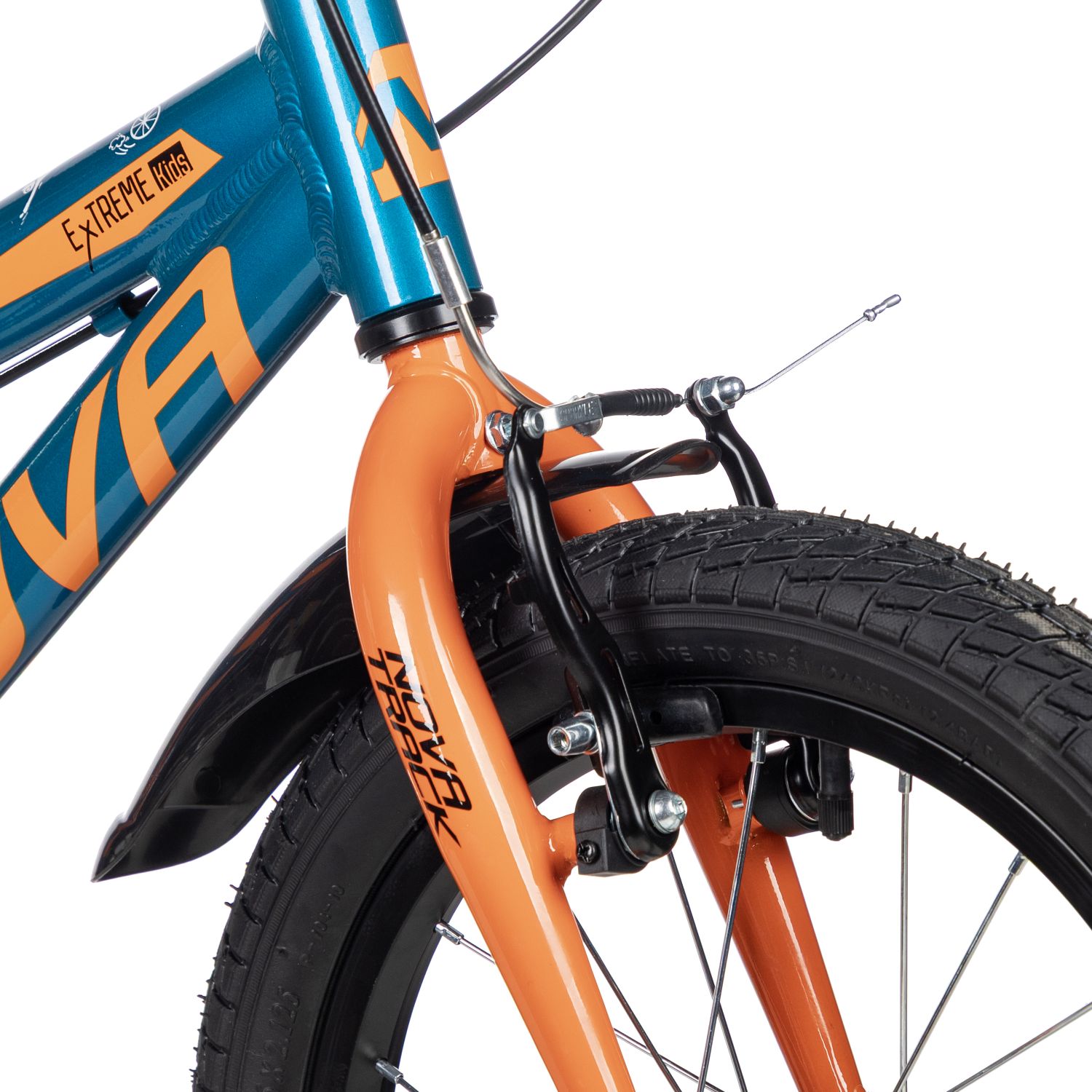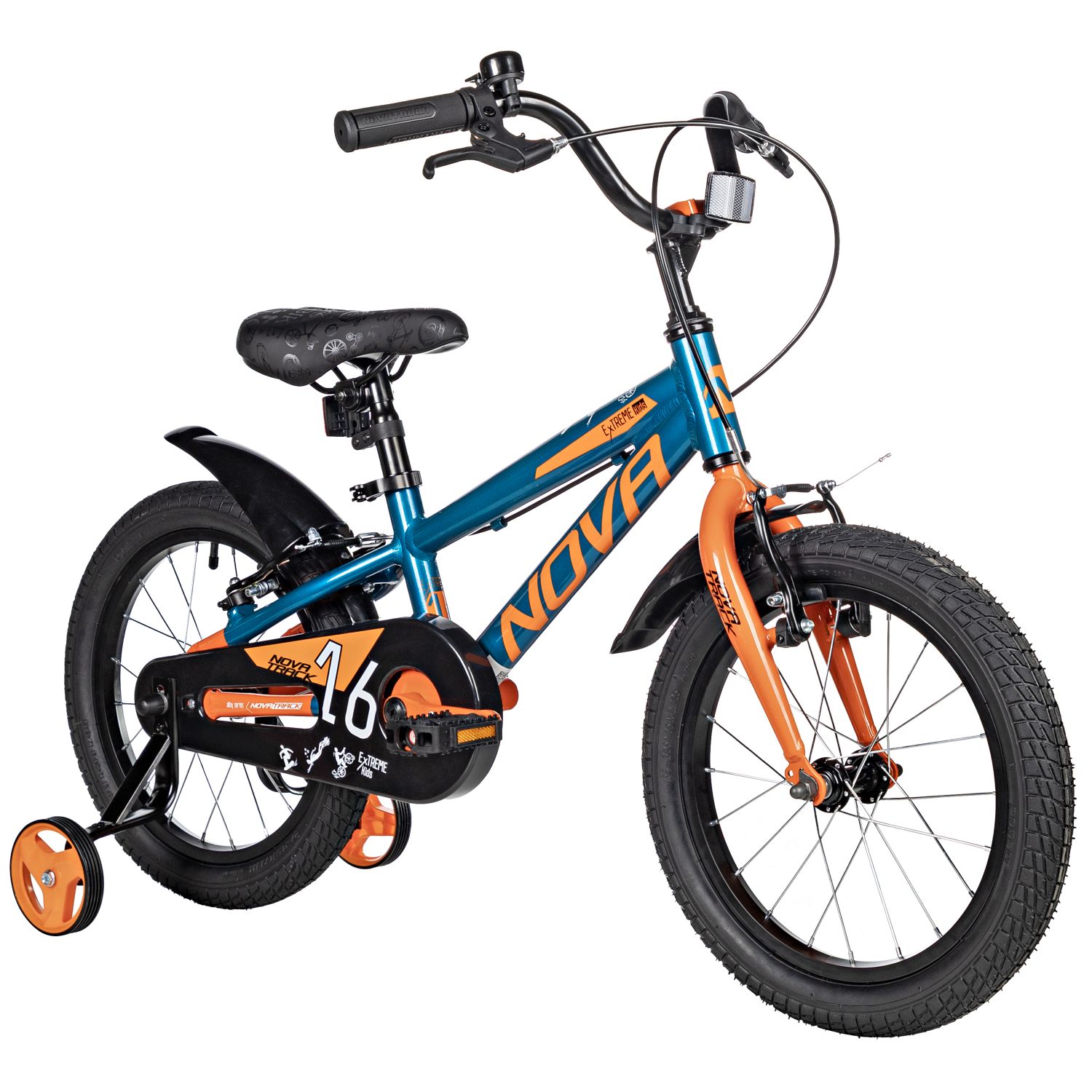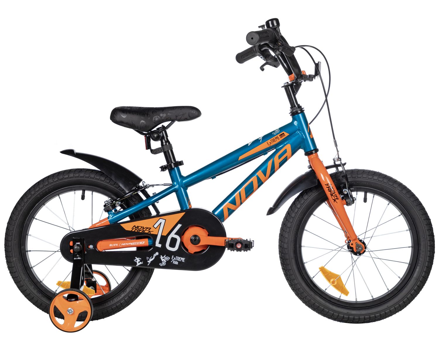 Велосипед NOVATRACK 16" EXTREME алюм., бирюзовый, полная защ.цепи, V-brake, короткие крылья, полная защита цепи