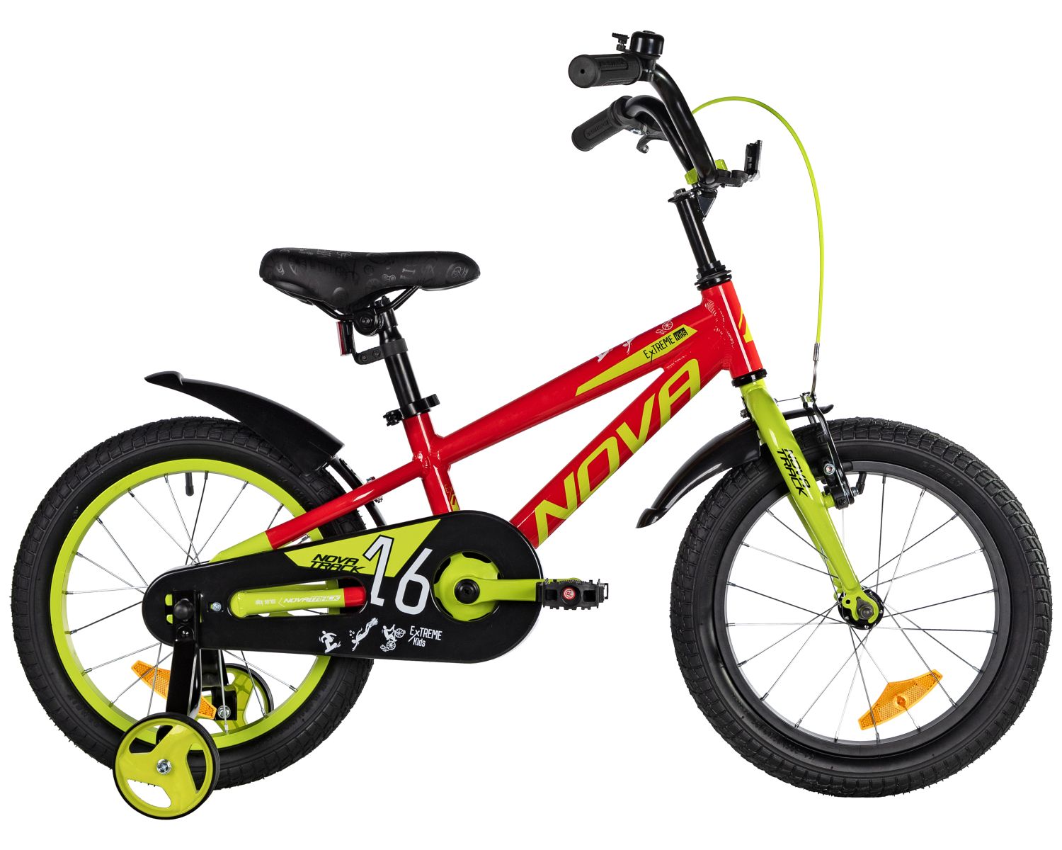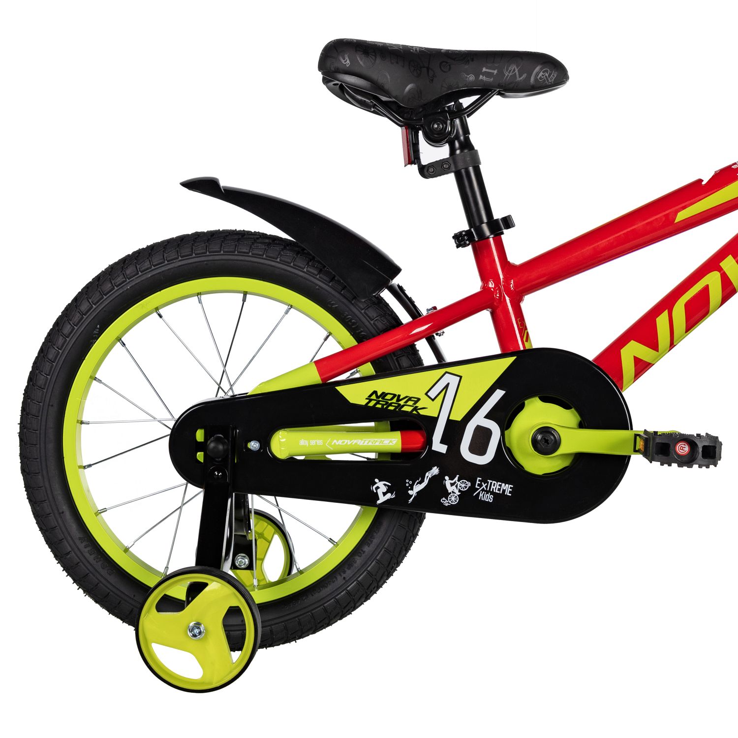 Велосипед NOVATRACK 16" EXTREME алюм., красный, полная защ.цепи, пер.руч., зад.нож. тормоз, короткие крылья, полная защита цепи
