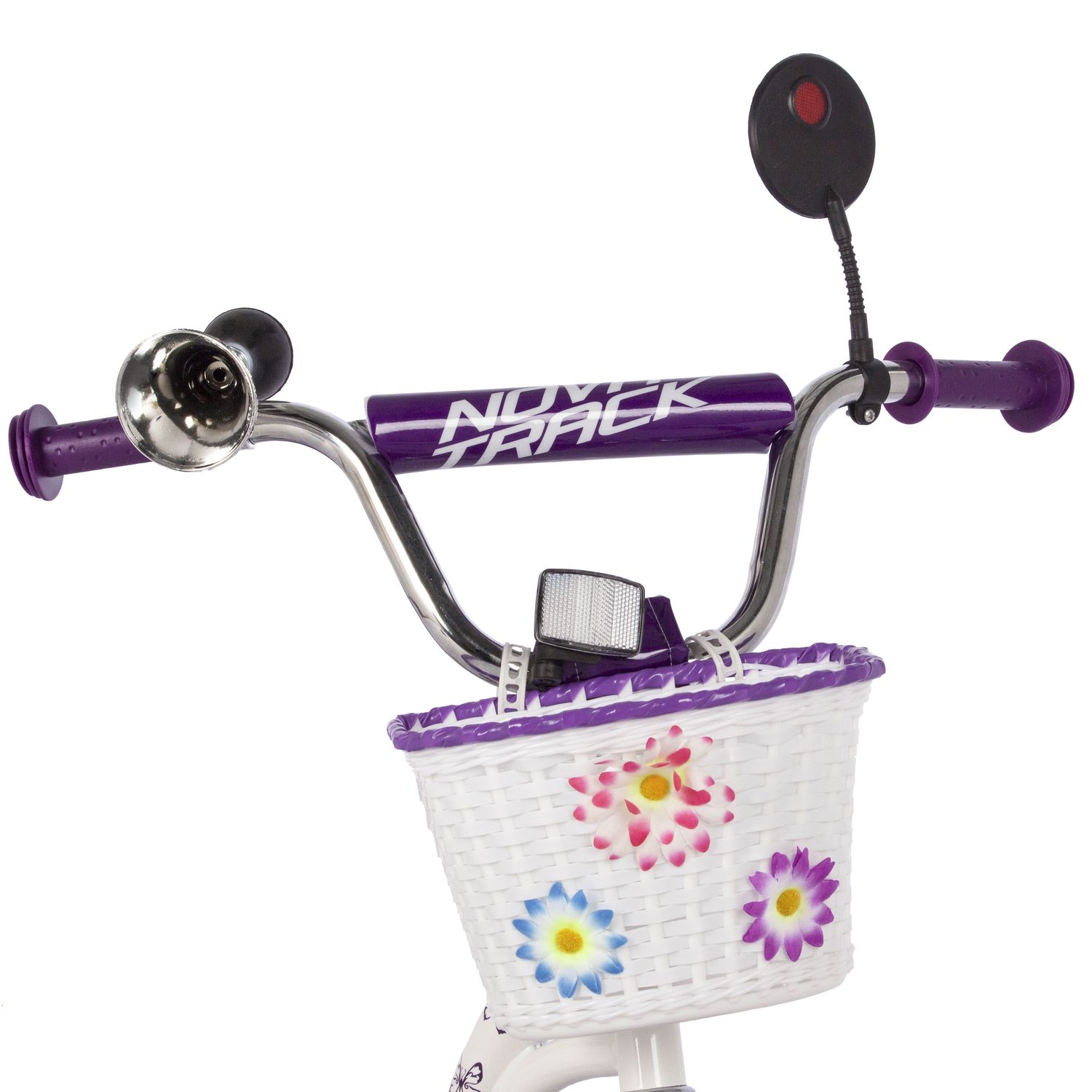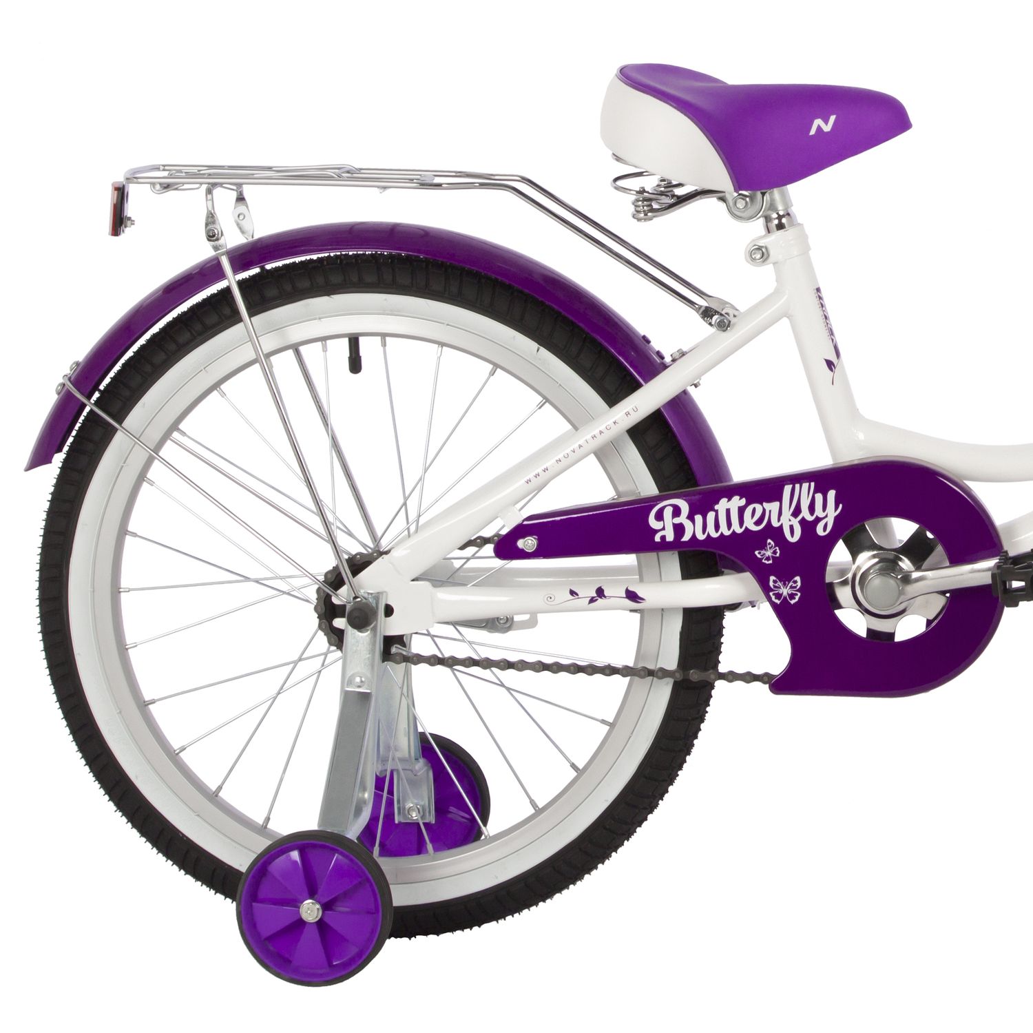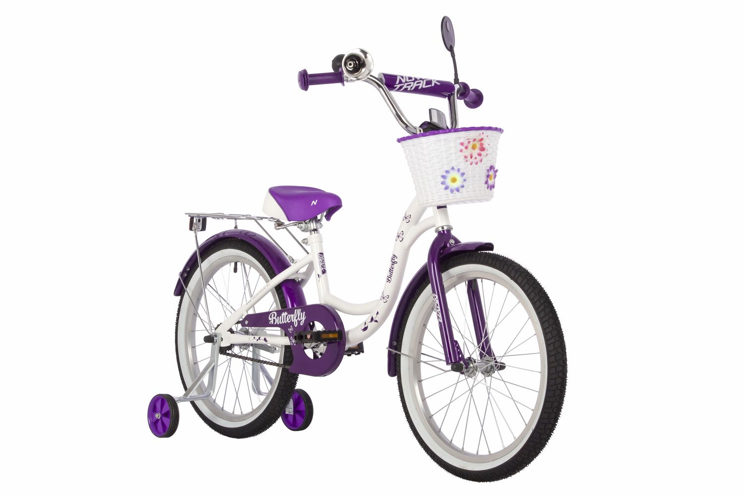 Велосипед NOVATRACK 20" BUTTERFLY, белый-фиолетовый, тормоз ножной, крылья и багажник