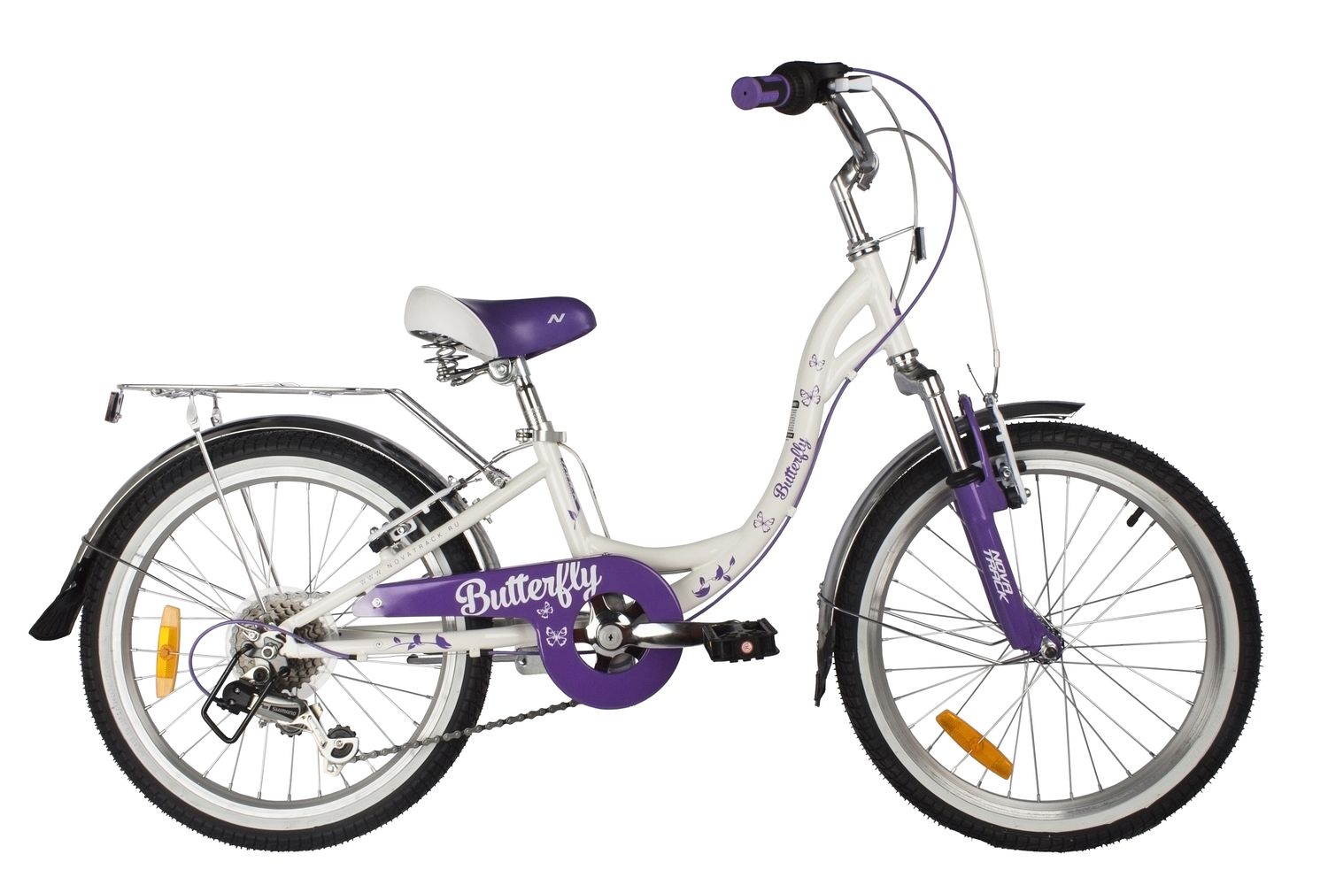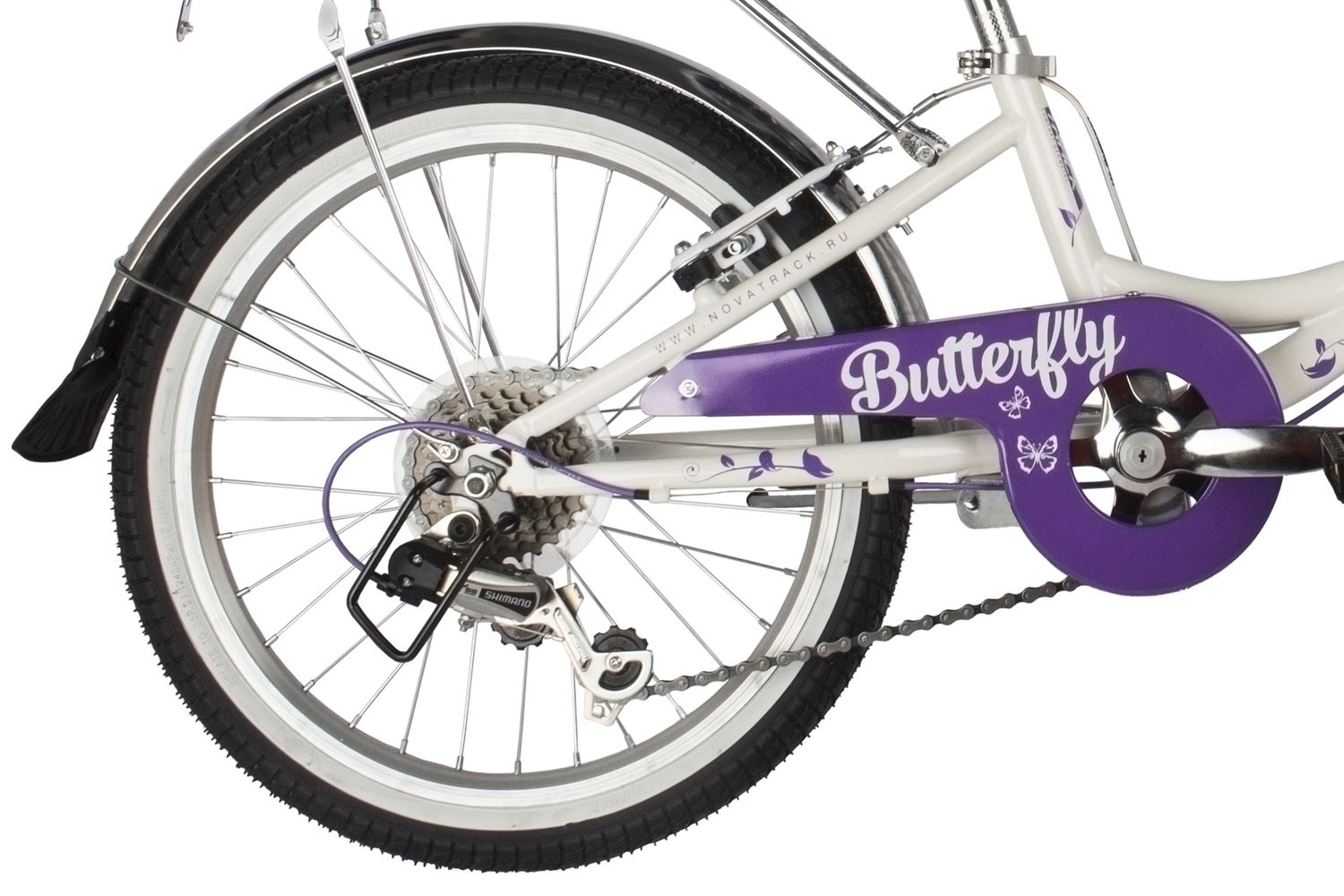 Велосипед NOVATRACK 20" BUTTERFLY сталь, белый-фиолет., 6-скор, TY21/RS35/SG-6SI, V-brake, багажник