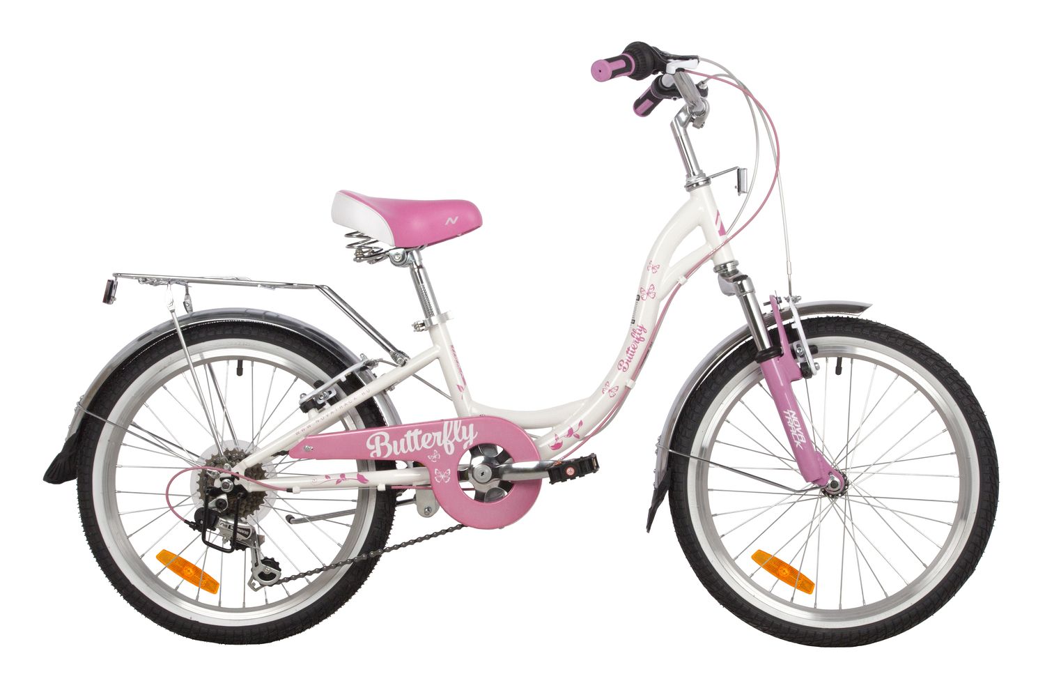 Велосипед NOVATRACK 20" BUTTERFLY сталь, белый-розовый, 6-скор, TY21/RS35/SG-6SI, V-brake, багажник