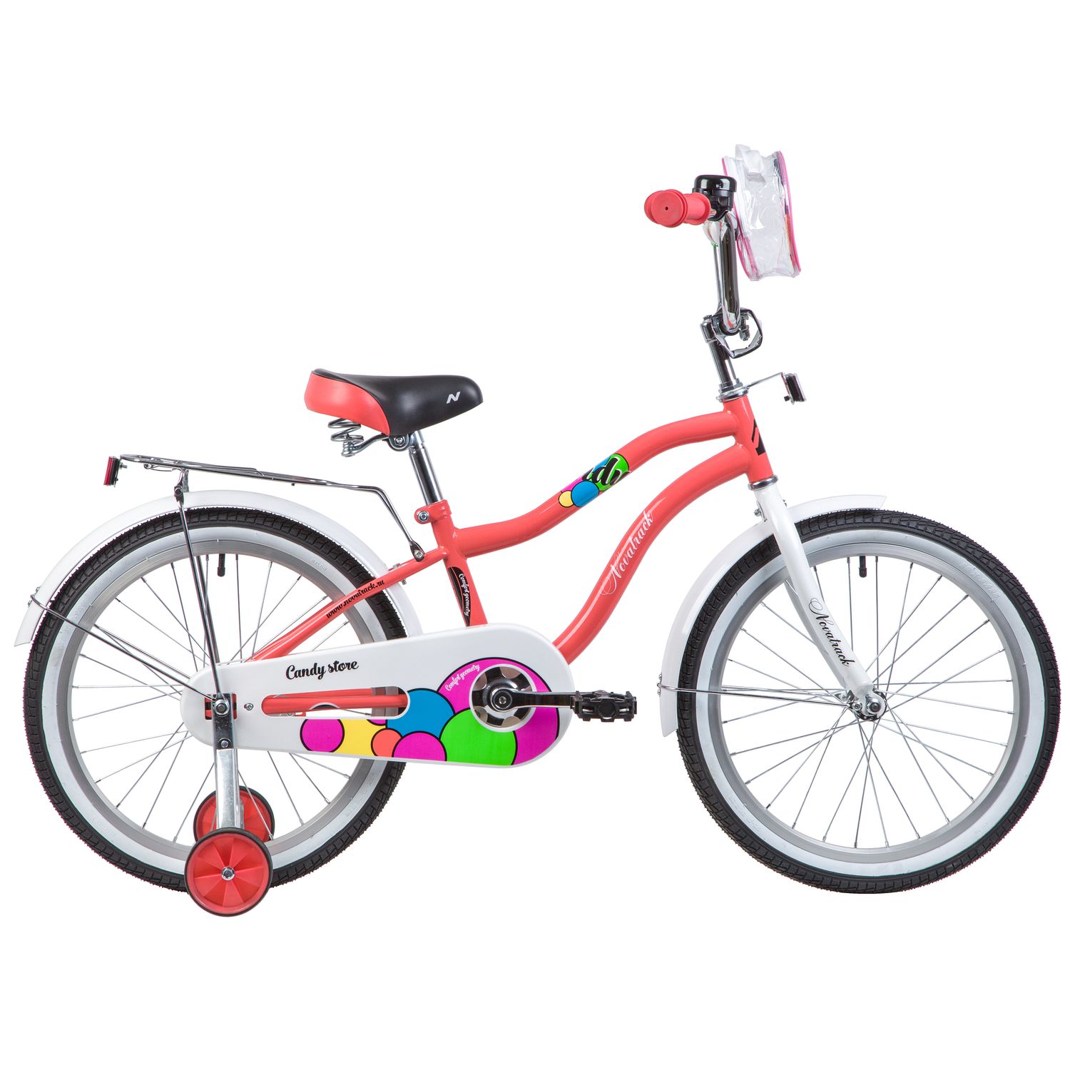 Велосипед NOVATRACK 20", CANDY, коралловый, полная защита цепи, тормоз нож., сумочка на руль, крылья