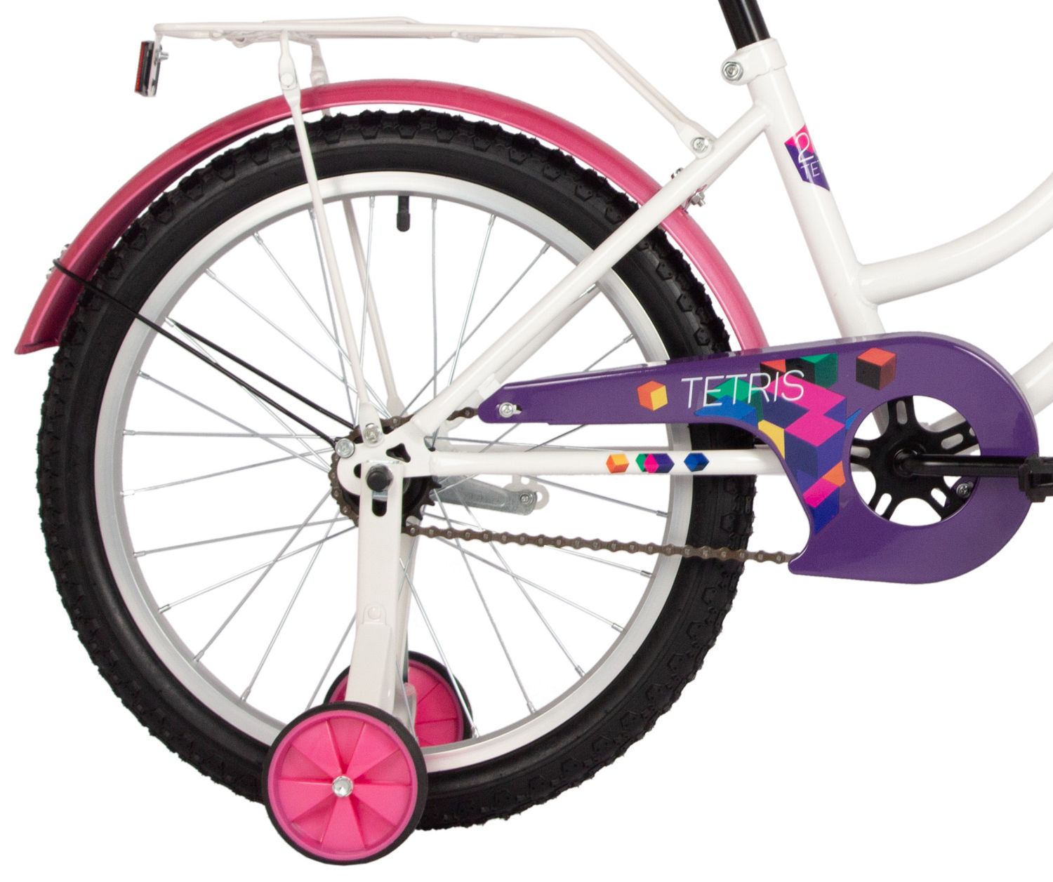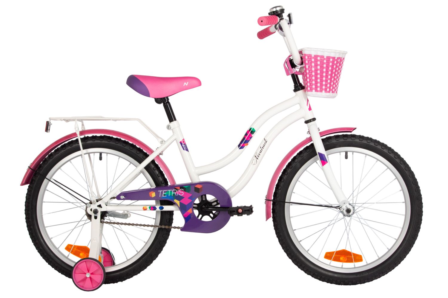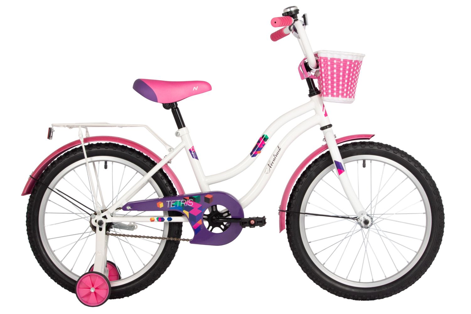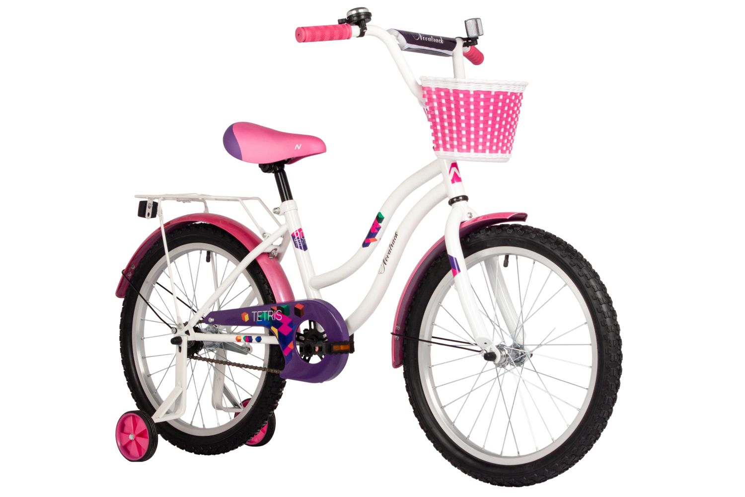 Велосипед NOVATRACK 20" TETRIS белый, тормоз нож, крылья цвет, багажник, корзина, защ.цепи