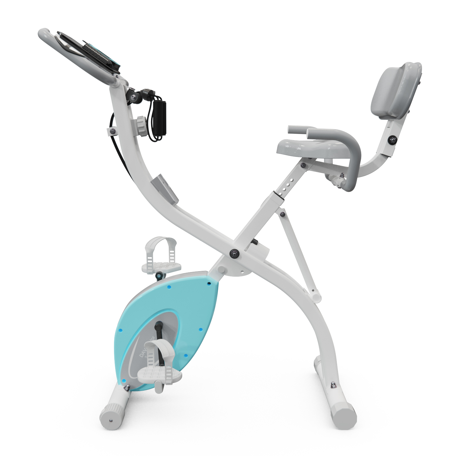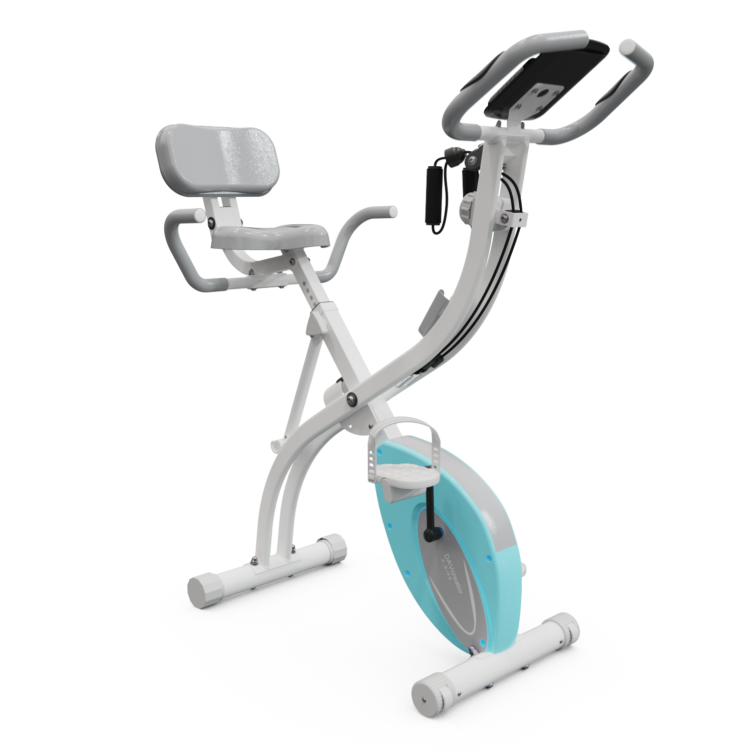 Благодаря складной конструкции, велотренажер легко хранить и переносить. Сиденье оборудовано спинкой и поручнями для дополнительного комфорта пользователя. В комплекте идет карман для хранения гаджетов.