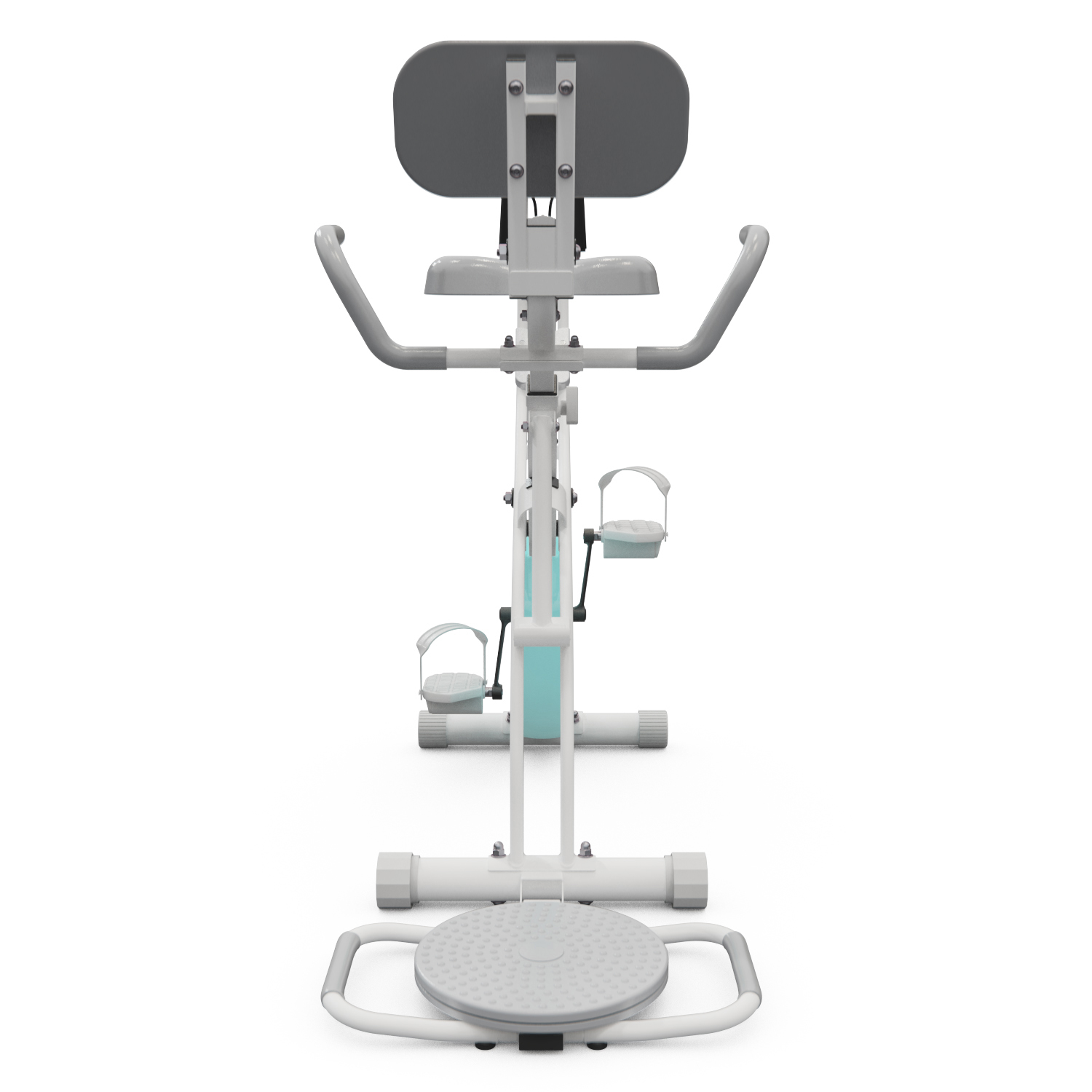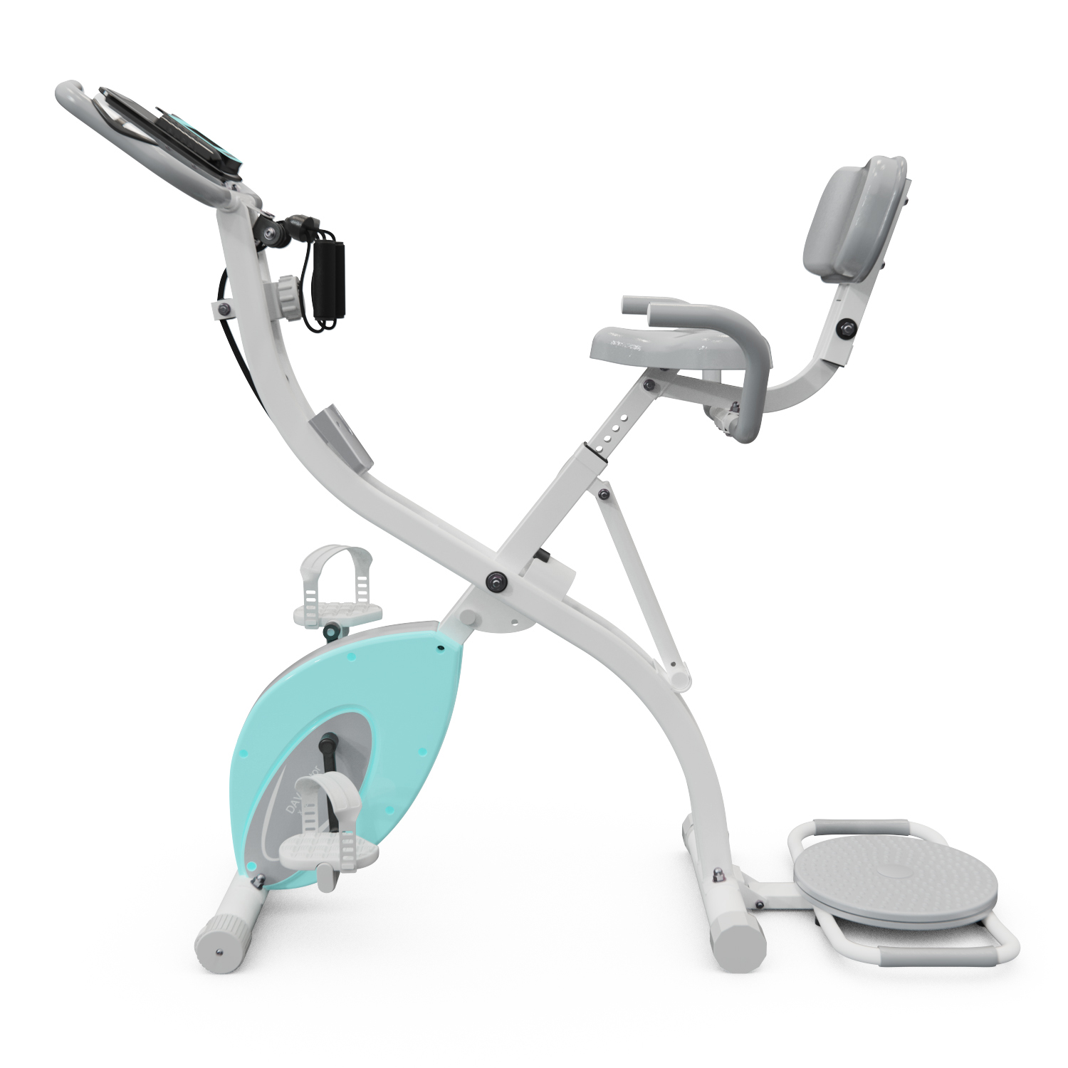Одной из особенностей этого велотренажера является его удобная складная конструкция. Сиденье обладает спинкой и поручнями для комфорта пользователя, а также имеет карман для хранения гаджета. Также в комплект входит твистер, который можно использовать для дополнительной тренировки пресса.