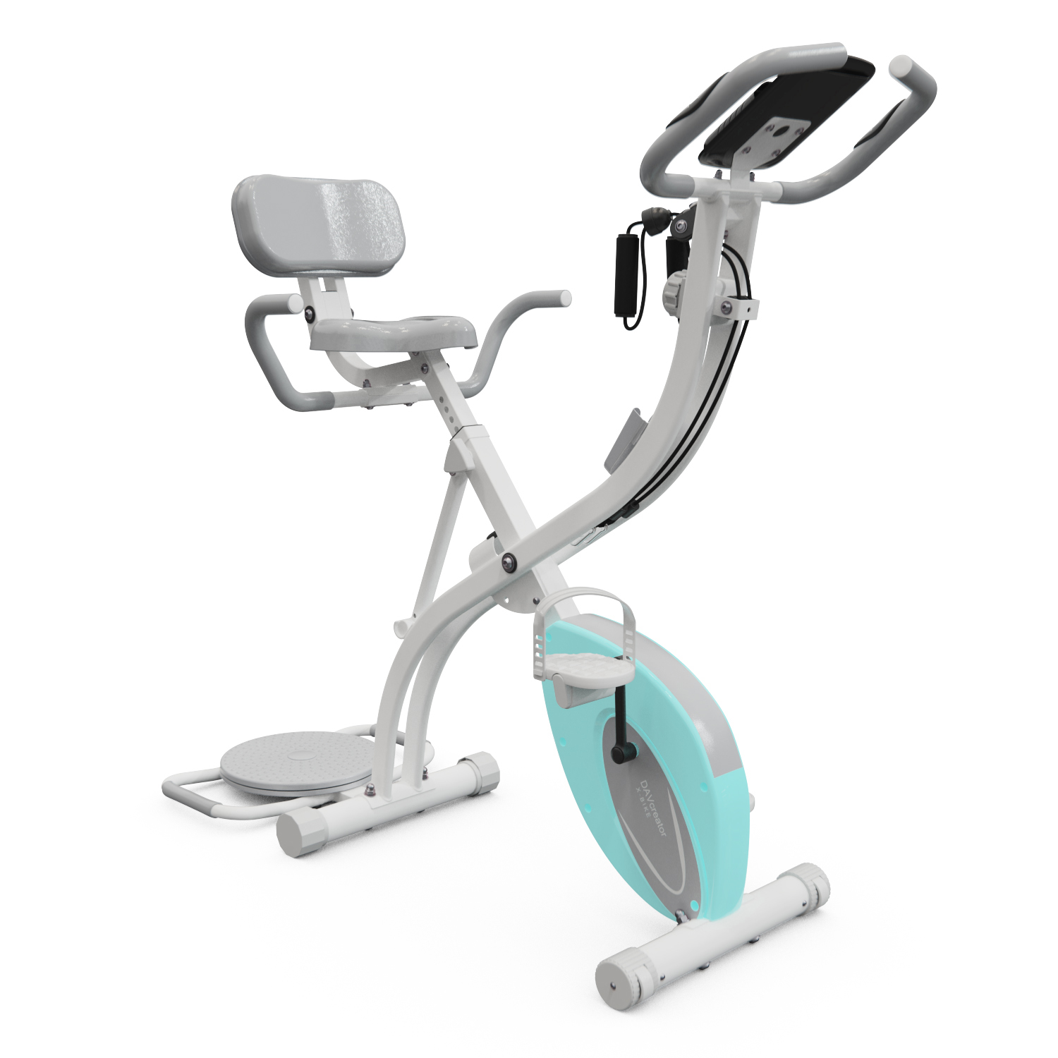 Велотренажер от DFC X-Bike DavCreator в красивом бело-голубом цвете. Он рассчитан на пользователей весом до 110 килограммов, что делает его подходящим для большинства людей.