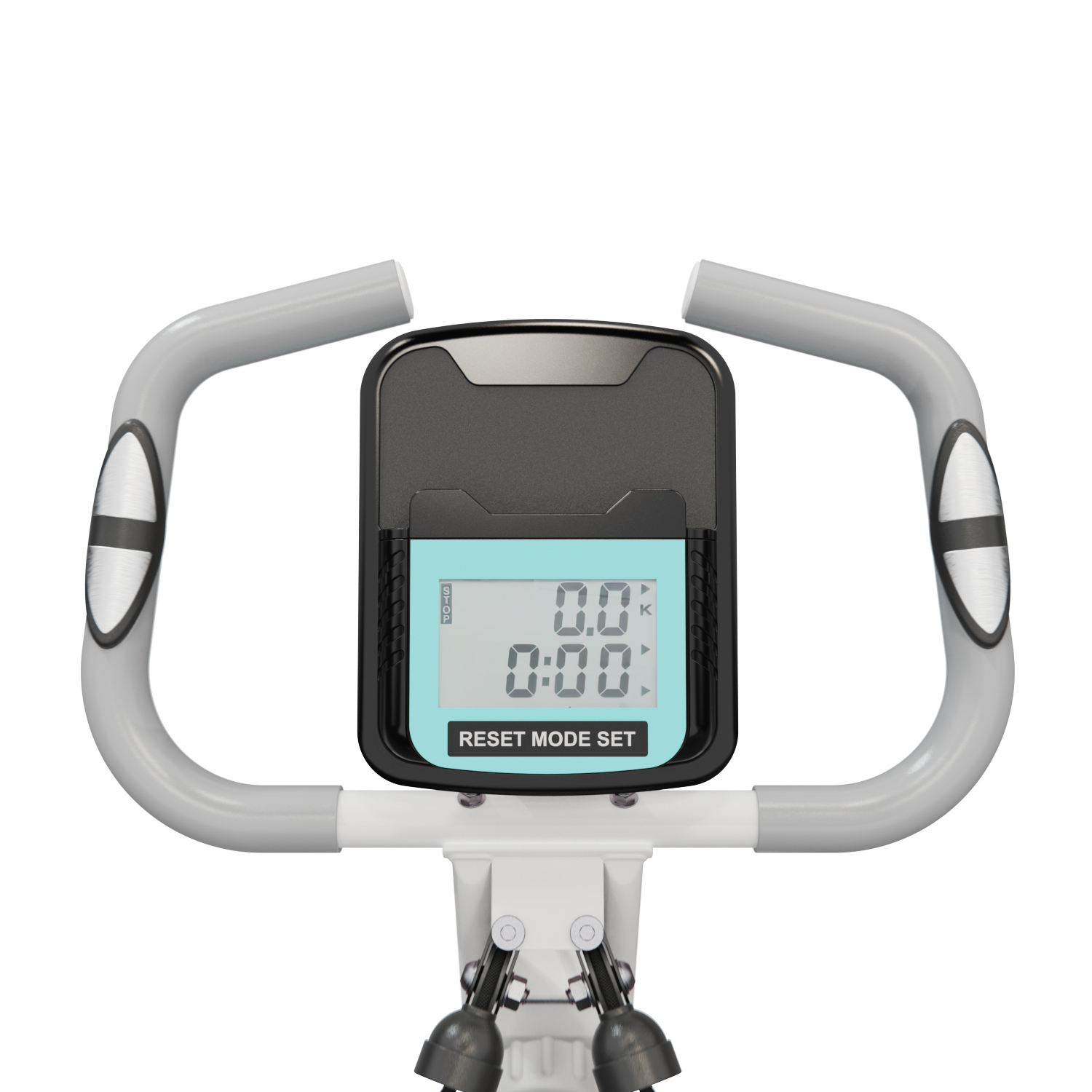 Дисплей этого велотренажера отображает важную информацию о тренировке, включая дистанцию, время, калории, одометр и пульс. Датчики пульса встроены в поручни, что обеспечивает удобство контроля за частотой сердечных сокращений. Для работы дисплея требуются батарейки типа AAA.