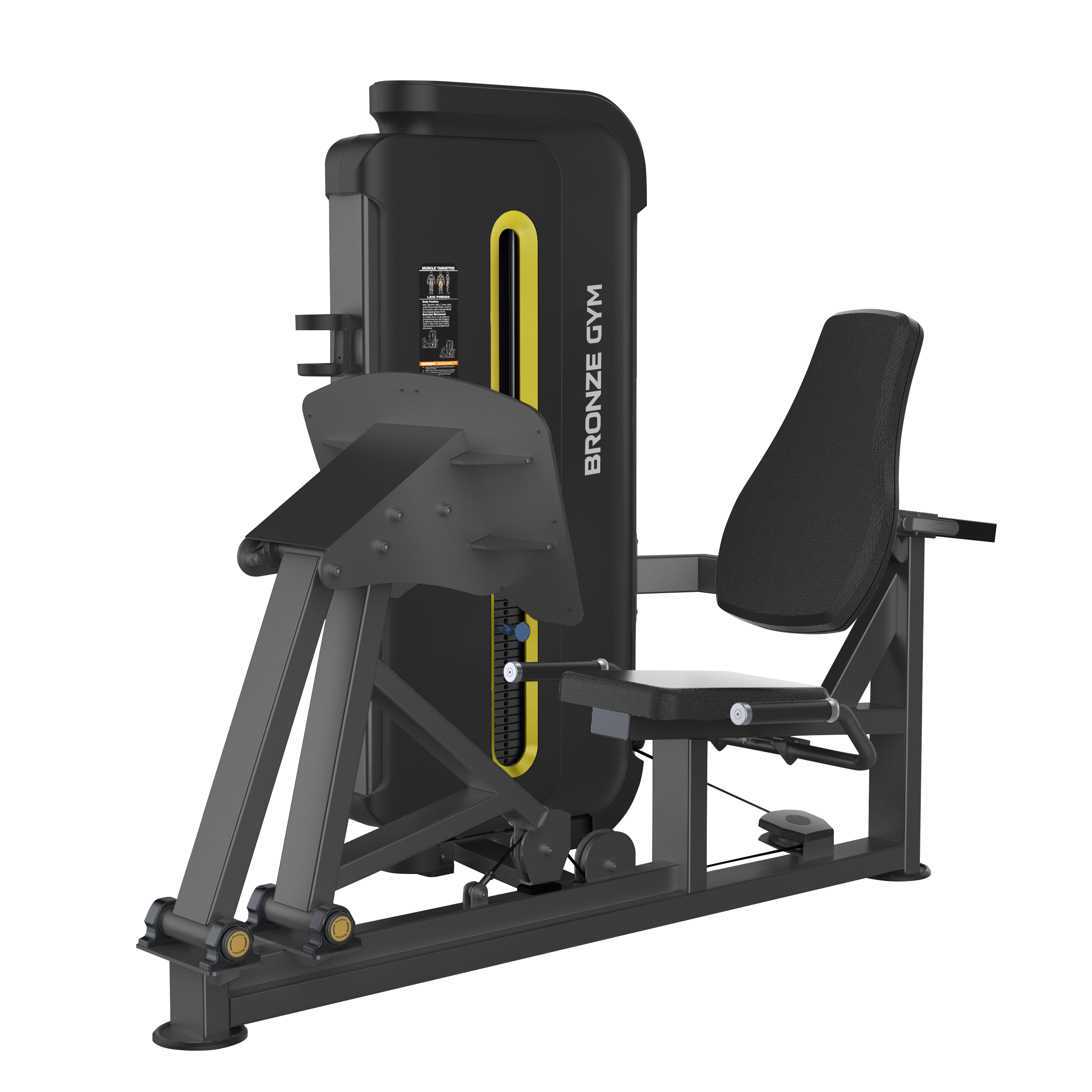 BRONZE GYM BW-3003 - это профессиональный тренажер коммерческого класса для выполнения упражнения жим ногами. Благодаря данной модели, пользователь сможет проработать мышцы ног. Рама BW-3003 с внушительными размерами 100*50 толщиной 2.5 мм и порошковой окраской в два слоя, выражает силу с первого взгляда. Прорезиненные, нескользящие рукоятки оборудования обеспечивают надежное сцепление рук пользователя во время занятий, что избавит от риска получения травм. Стальной трос в ПВХ оболочке общим диаметром 6 мм отвечает за подъем грузов. Между прочим, это один из самых высоких показателей в классе. Весовые плиты изготовлены из прочной легированной стали. Общий вес стека составляет 109 кг. Для простоты использования, все фиксаторы на тренажере выполнены в ярких цветах.* Это очень важная деталь, особенно для слабовидящих пользователей. Установленное на модели эргономичное сиденье из искусственной кожи гарантирует повышенный комфорт пользователя на протяжении всех подходов при выполнении упражнения. Мягкость обеспечивают подушки с полиуретановым наполнителем. Спинка сиденья регулируется по горизонтали. В качестве дополнения BRONZE GYM BW-3003 оснащен держателем для бутылочки с водой и полотенца.